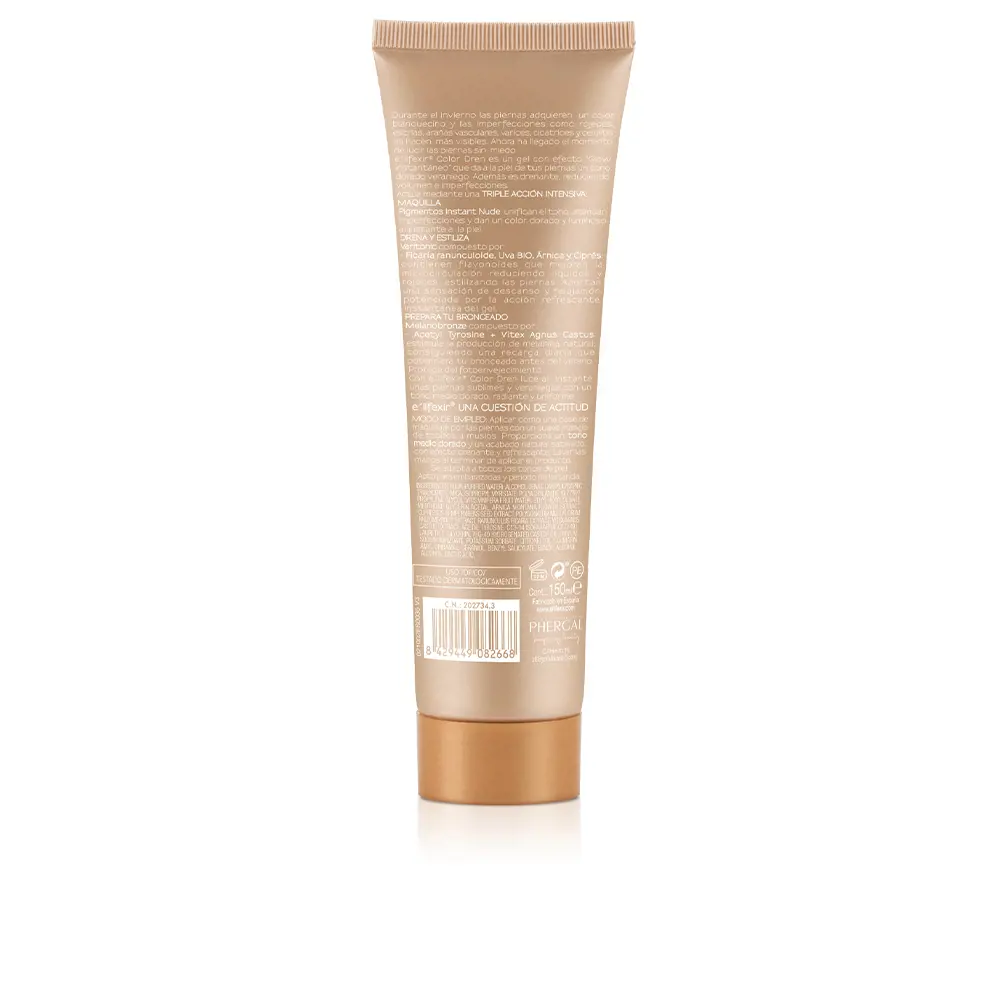 Зимой ноги приобретают беловатый цвет, а недостатки, такие как покраснения, растяжки, сосудистые звездочки, варикозное расширение вен, шрамы и целлюлит, становятся более заметными. Теперь пришло время без страха продемонстрировать свои ноги. Elifexir Color Dren – гель с эффектом «мгновенного фотошопа», придающий коже ног летний золотистый оттенок. Он также дренирует, уменьшает объем и несовершенства.