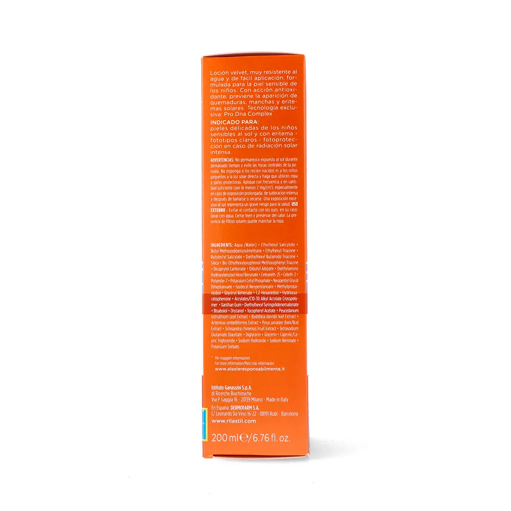 SUN SYSTEM SPF50+ BABY RILASTIL velluto молочко. Фотопротектор для детского тела с бархатистой текстурой. Водонепроницаемый. Без запаха. Гипоаллергенный. Клинически протестировано под педиатрическим и дерматологическим контролем (от 3 до 14 лет). Это первый экологически чистый детский фотопротектор для тела с бархатистой текстурой. Rilastil Sun System SPF50+ Baby Milk Velluto защищает кожу, делая ее мягкой и гладкой. Благодаря многочисленным активным ингредиентам он оказывает увлажняющее и эластичное действие, возвращая коже ребенка максимальный комфорт. Никакого эффекта белого цвета. Основные компоненты: Система фильтров: синергия фотозащитных молекул, гарантирующая широкий спектр защиты от UVB-UVA. Комплекс Pro-Dna: набор специфических растительных экстрактов с антиоксидантным действием. Экстракт лимонника китайского: обеспечивает эластичность кожи. Витамин Е: успокаивающее действие. Альфа-бисаболол: успокаивающее действие.