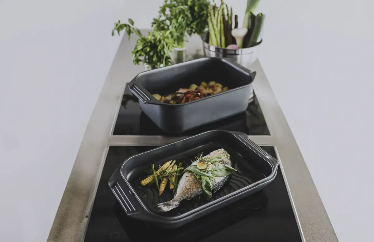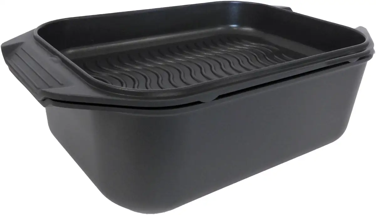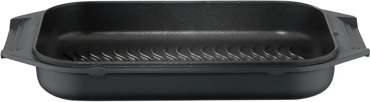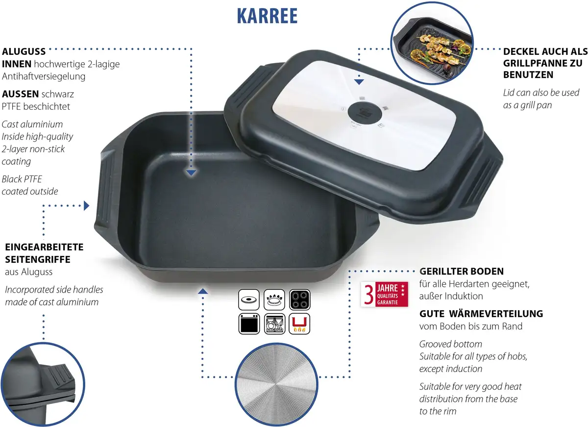 Высокая жаровня из литого алюминия, ELO. Высококачественный литой алюминий с двойным антипригарным покрытием. Никакого прилипания жареных продуктов, легкая и быстрая очистка. Встроенные боковые крепления из литого алюминия. Равномерное распределение тепла вплоть до края, экономя время и энергию. Можно мыть в посудомоечной машине и запекать в духовке при температуре до 240°C. Крышку можно использовать как крышку для гриля. Подходит для всех типов плит, кроме индукционных. Размеры жаровни 41,6 х 25,6 х 12,2 см.