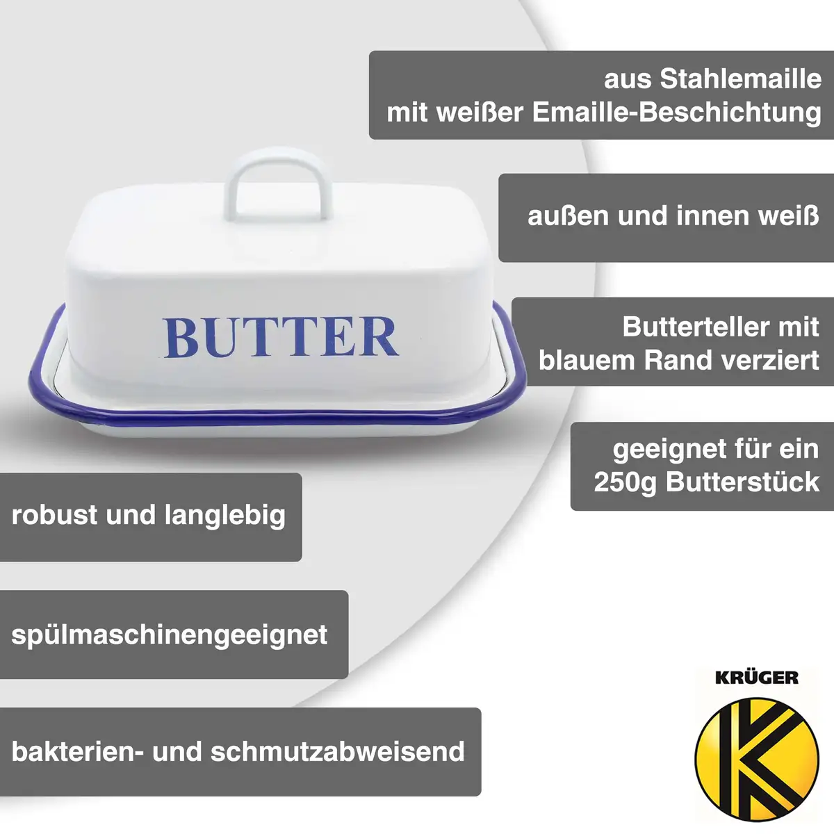 Масленка "Хусум" изготовлена ​​из эмали с синим краем, устойчива к царапинам и порезам. Прочная поверхность гарантирует длительный срок службы и обеспечивает оптимальную гигиену в доме.