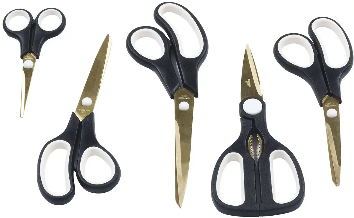 Набор ножниц из 5 предметов позволяет удобно и комфортно резать самые разные материалы. Все лезвия покрыты титаном и отличаются особой остротой. Вы получите подходящие ножницы для любых целей. Эргономичные ручки с мягким покрытием имеют прорезиненные накладки для рук и мягкую силиконовую поверхность (TPR). Поэтому ножницы особенно удобны и их легко держать даже при длительном использовании.