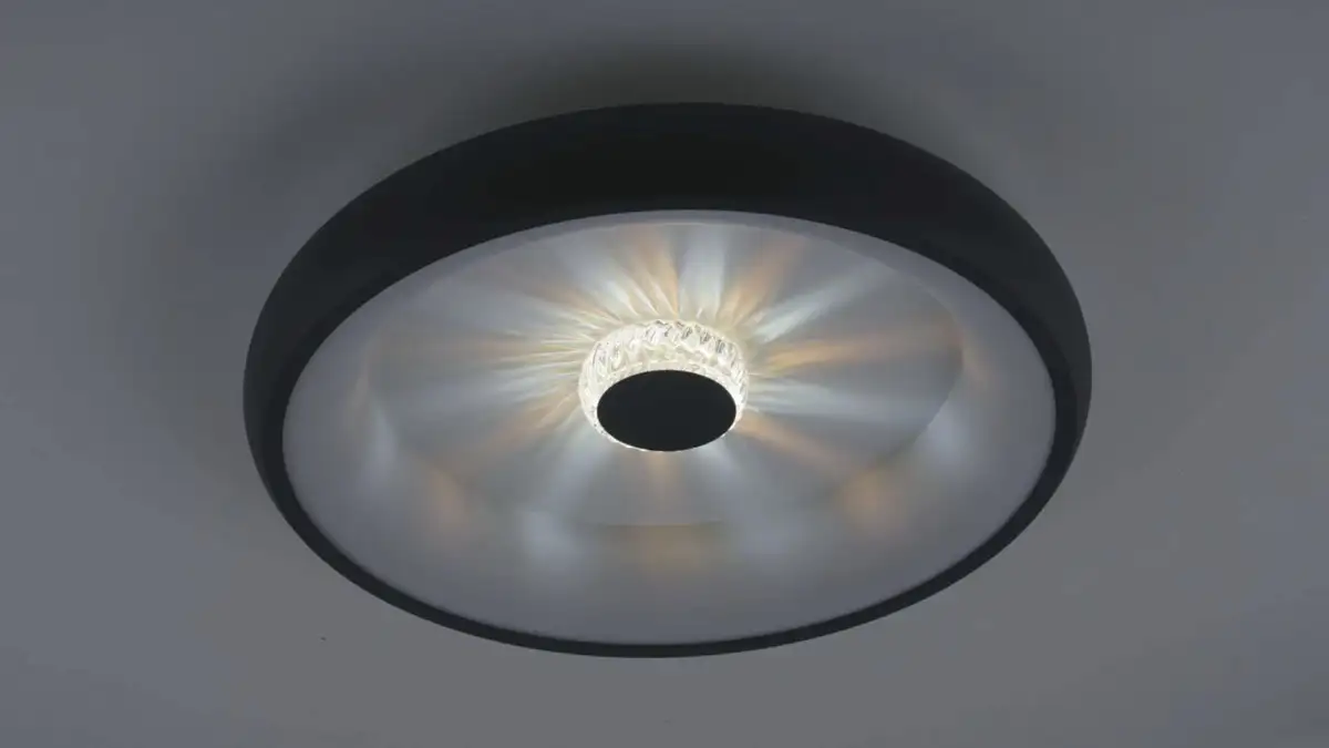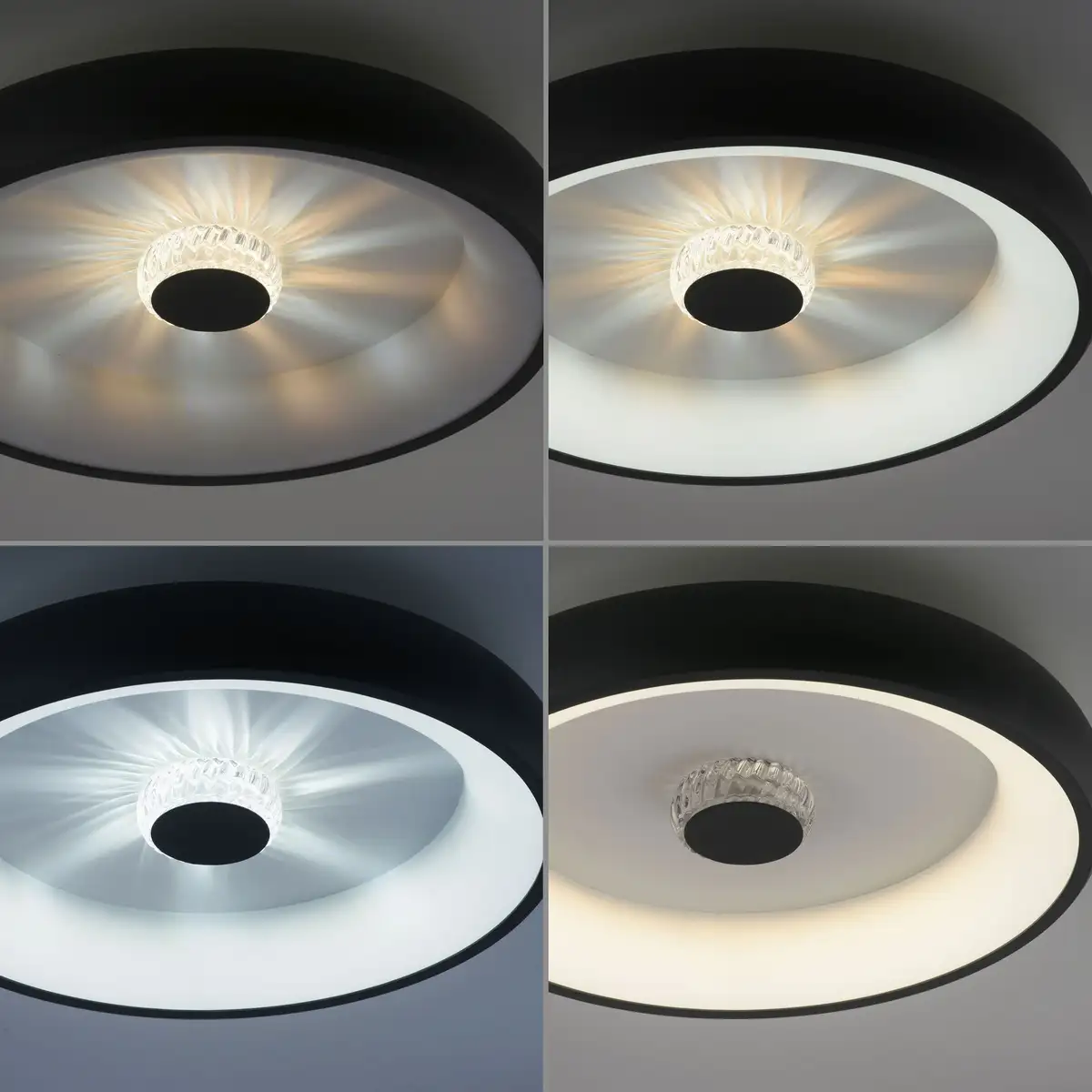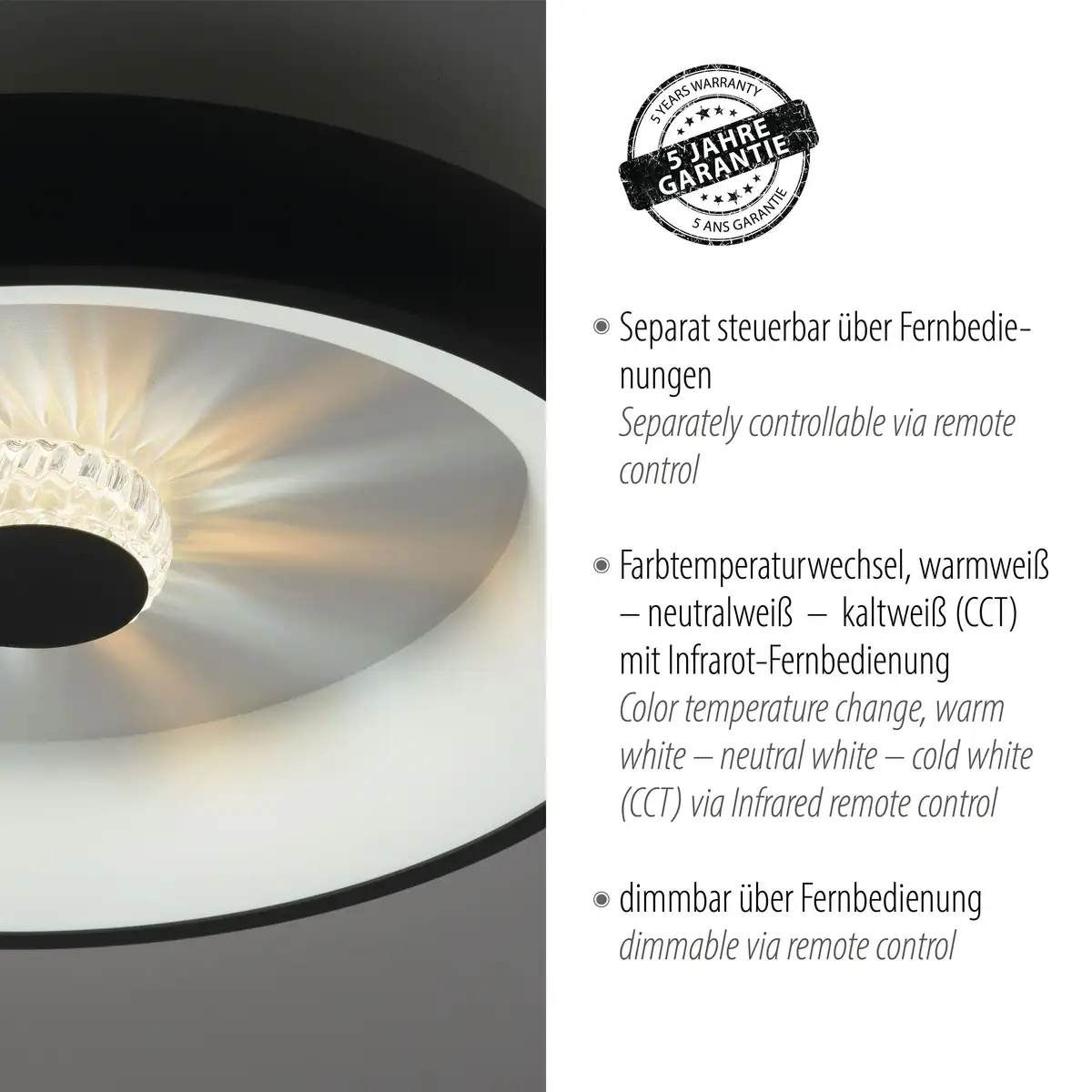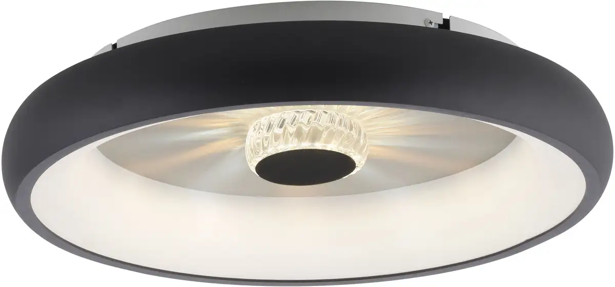 Потолочный светодиодный светильник VERTIGO сочетает в себе элегантный дизайн, инновационные технологии и волшебные световые эффекты. Круглый дизайн и черный цвет придадут вашей комнате неподвластную времени элегантность. Благодаря функции плавного регулирования яркости вы можете полностью контролировать яркость освещения. Отрегулируйте свет в соответствии с вашими потребностями и создайте желаемую атмосферу в своей комнате. Яркий рабочий свет или приглушенная романтическая атмосфера — потолочный светильник VERTIGO исполнит ваши желания одним нажатием кнопки. Входящий в комплект радиопульт дистанционного управления делает управление фонарем особенно удобным. Легко управляйте яркостью и цветом света удаленно, не вставая с места. Располагайтесь поудобнее и наслаждайтесь беспроводным управлением освещением. Благодаря встроенной функции памяти потолочный светильник VERTIGO запоминает ваши индивидуальные настройки. Даже после выключения и повторного включения предпочитаемая интенсивность света и цвет сохранятся без необходимости повторной настройки. С помощью регулятора цветовой температуры CCT вы можете индивидуально регулировать оттенок света от теплого белого света (2700 К) до дневного белого света (5000 К). Создайте уютную атмосферу или украсьте комнату естественным дневным светом – выбор полностью за вами. Особой изюминкой является красивый кристаллический эффект в центре лампы. Это создает завораживающую игру света. Позвольте себе быть очарованным сверкающими отражениями и насладитесь особым талантом, который предлагает вам VERTIGO.