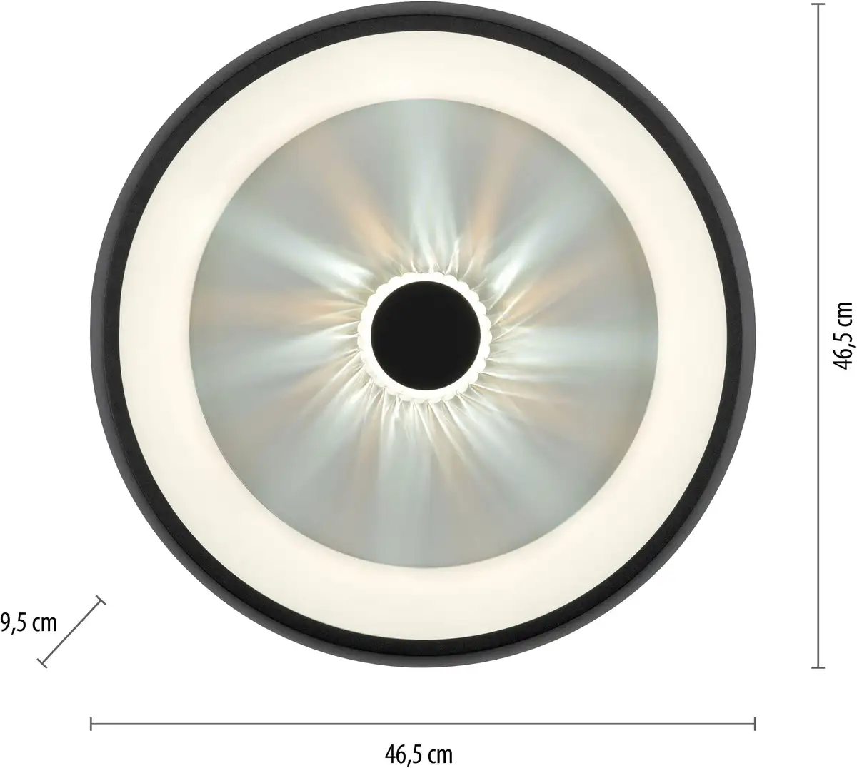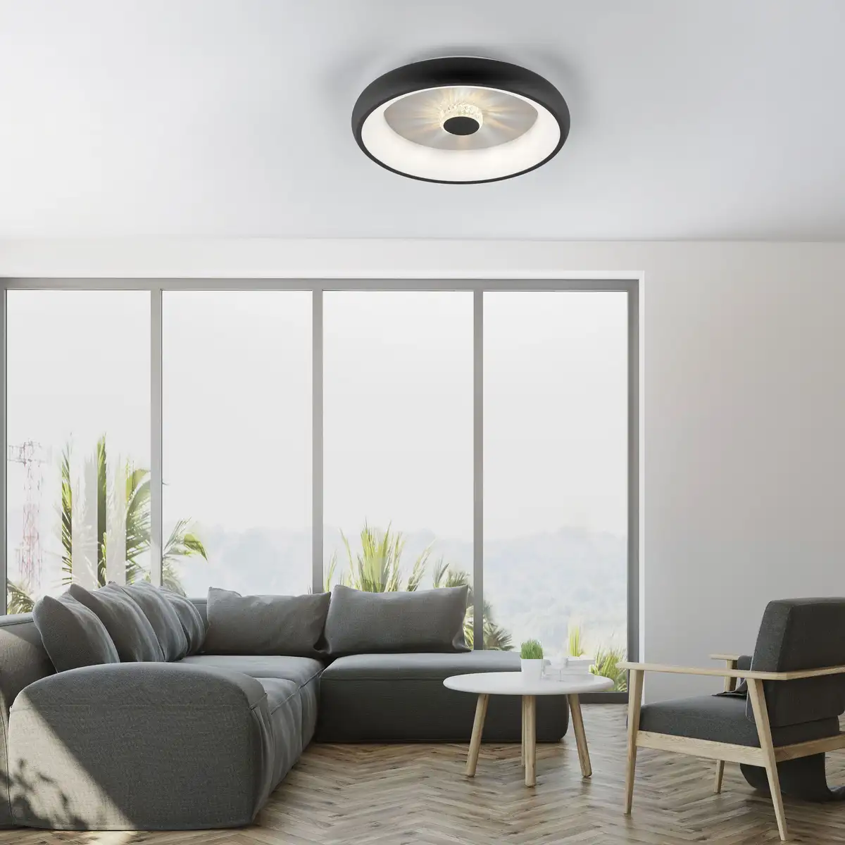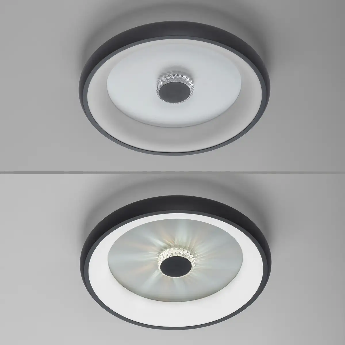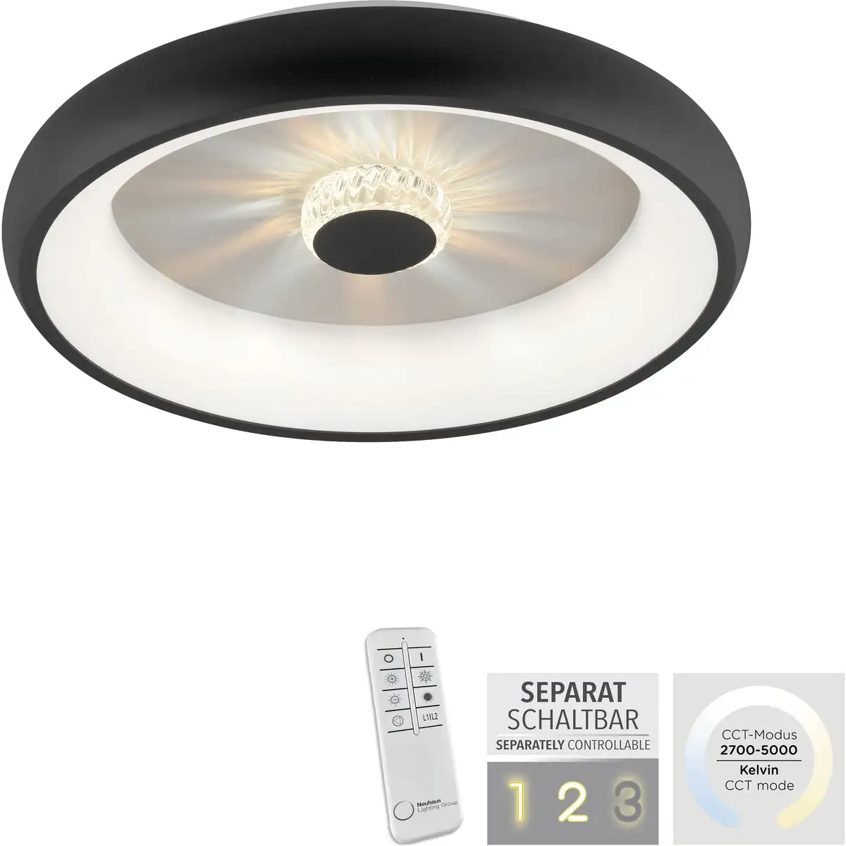 Потолочный светодиодный светильник VERTIGO сочетает в себе элегантный дизайн, инновационные технологии и волшебные световые эффекты. Круглый дизайн и черный цвет придадут вашей комнате неподвластную времени элегантность. Благодаря функции плавного регулирования яркости вы можете полностью контролировать яркость освещения. Отрегулируйте свет в соответствии с вашими потребностями и создайте желаемую атмосферу в своей комнате. Яркий рабочий свет или приглушенная романтическая атмосфера — потолочный светильник VERTIGO исполнит ваши желания одним нажатием кнопки. Входящий в комплект радиопульт дистанционного управления делает управление фонарем особенно удобным. Легко управляйте яркостью и цветом света удаленно, не вставая с места. Располагайтесь поудобнее и наслаждайтесь беспроводным управлением освещением. Благодаря встроенной функции памяти потолочный светильник VERTIGO запоминает ваши индивидуальные настройки. Даже после выключения и повторного включения предпочитаемая интенсивность света и цвет сохранятся без необходимости повторной настройки. С помощью регулятора цветовой температуры CCT вы можете индивидуально регулировать оттенок света от теплого белого света (2700 К) до дневного белого света (5000 К). Создайте уютную атмосферу или украсьте комнату естественным дневным светом – выбор полностью за вами. Особой изюминкой является красивый кристаллический эффект в центре лампы. Это создает завораживающую игру света. Позвольте себе быть очарованным сверкающими отражениями и насладитесь особым талантом, который предлагает вам VERTIGO.