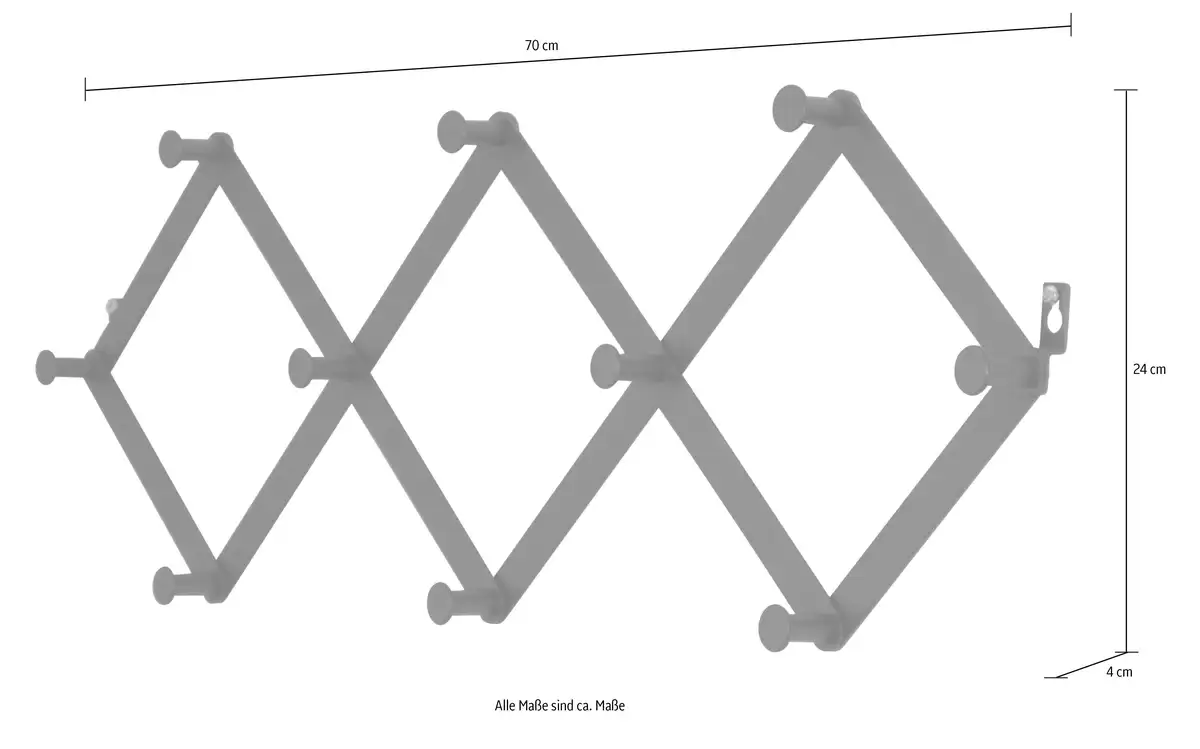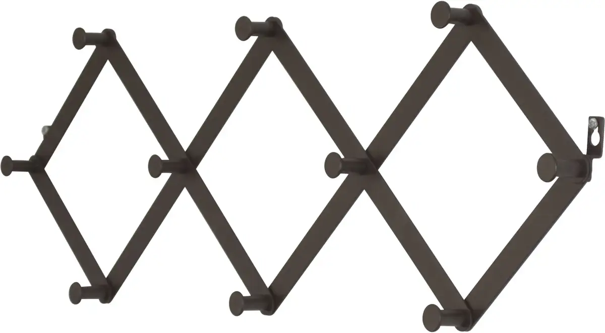 В зависимости от ширины его можно раздвигать как гармошку. Всего 10 металлических крючков. Для настенного монтажа.