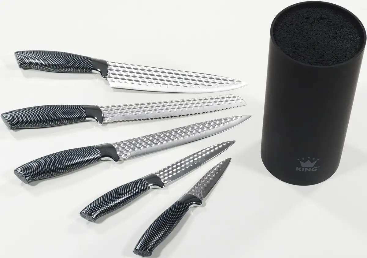 Набор блоков для ножей KING CARBON DIAMOND станет настоящим украшением вашей кухни. Особая сотовая структура лезвий ножей обеспечивает меньшее прилипание к лезвиям при резке и делает лезвия ножей особенно устойчивыми. Рукоятки ножей имеют эргономичную форму и приятны на ощупь.