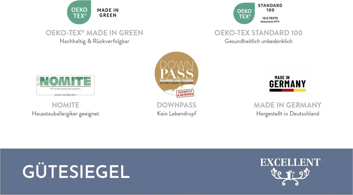 Материал: Чехол: 100% хлопок. Наполнитель: 90% пух, 10% перо. объем поставки Количество деталей: 1 шт. Инструкции по уходу Рекомендации по уходу: подходит для сушки в сушильной машине. Машинная стирка при 60°C. Полезная информация Информация для аллергиков: Подходит для людей, страдающих аллергией на домашнюю пыль (NOMITE). Специальная информация: Сертифицировано Downpass. сделано в Германии Тестовая печать: Протестировано Институтом Хоэнштайна: HL 16.8.9.0004 «БЕЗОПАСНО ДЛЯ КОЖИ, АЛЛЕРГИИ» OEKO-TEX Standard 100 Номер сертификата: Коллективный сертификат 09.0.67812 В целом Чехол: 100 % хлопок Наполнитель: 90 % пух, 10 % перо.