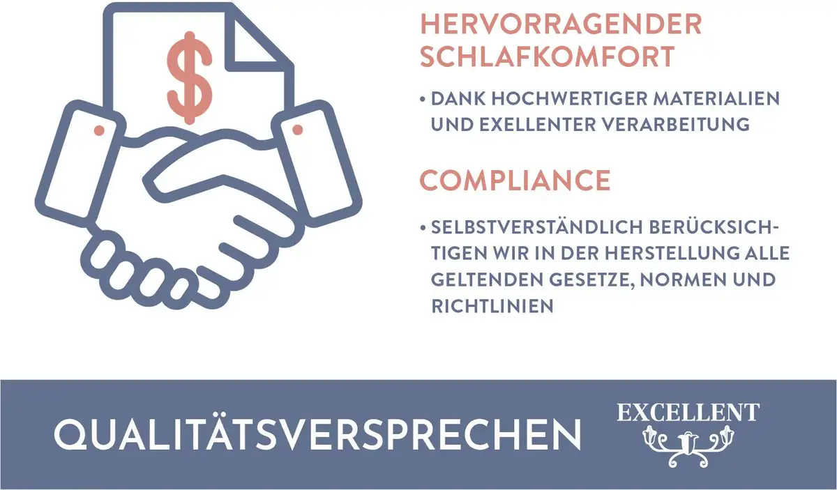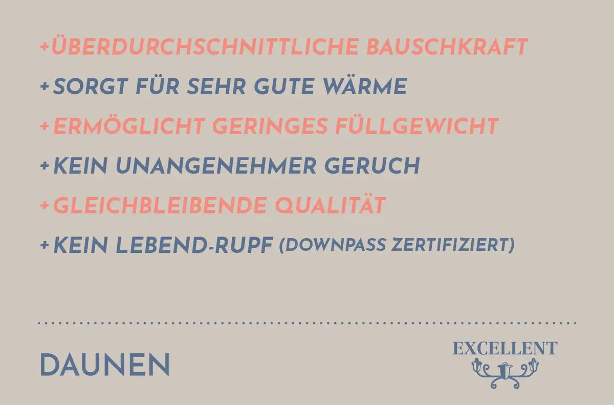 Материал: Чехол: 100% хлопок. Наполнитель: 90% пух, 10% перо. объем поставки Количество деталей: 1 шт. Инструкции по уходу Рекомендации по уходу: подходит для сушки в сушильной машине. Машинная стирка при 60°C. Полезная информация Информация для аллергиков: Подходит для людей, страдающих аллергией на домашнюю пыль (NOMITE). Специальная информация: Сертифицировано Downpass. сделано в Германии Тестовая печать: Протестировано Институтом Хоэнштайна: HL 16.8.9.0004 «БЕЗОПАСНО ДЛЯ КОЖИ, АЛЛЕРГИИ» OEKO-TEX Standard 100 Номер сертификата: Коллективный сертификат 09.0.67812 В целом Чехол: 100 % хлопок Наполнитель: 90 % пух, 10 % перо.