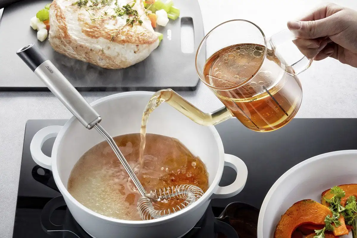 В кувшин наливают горячие супы, соусы и подливки и - как только жир осядет сверху - обезжиренную жидкость можно медленно выливать из кувшина для отделения жира. Кроме того, практичное сито задерживает твердые частицы – без необходимости трудоемкой фильтрации! Масштабирование термостойкого кувшина помогает точно дозировать жидкость.