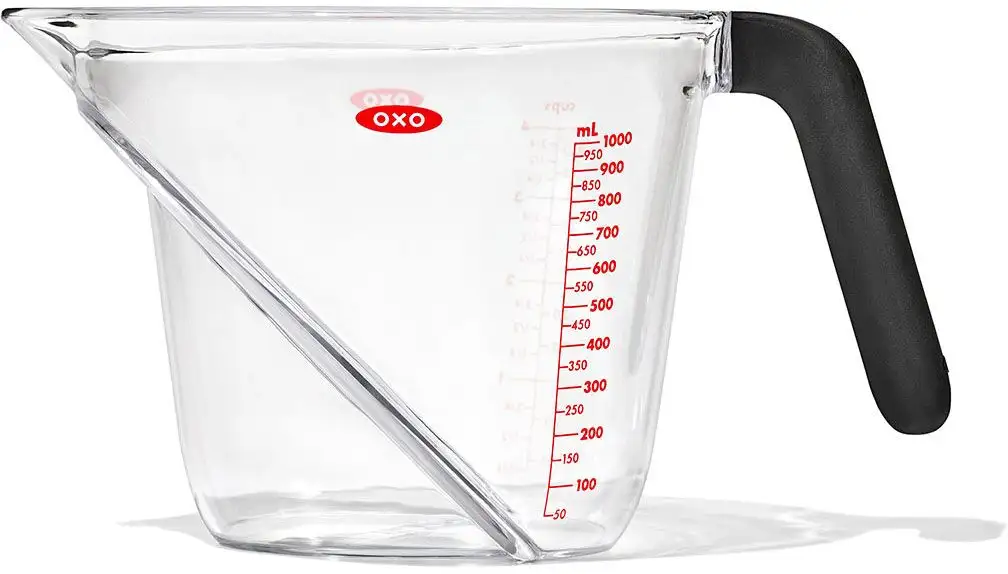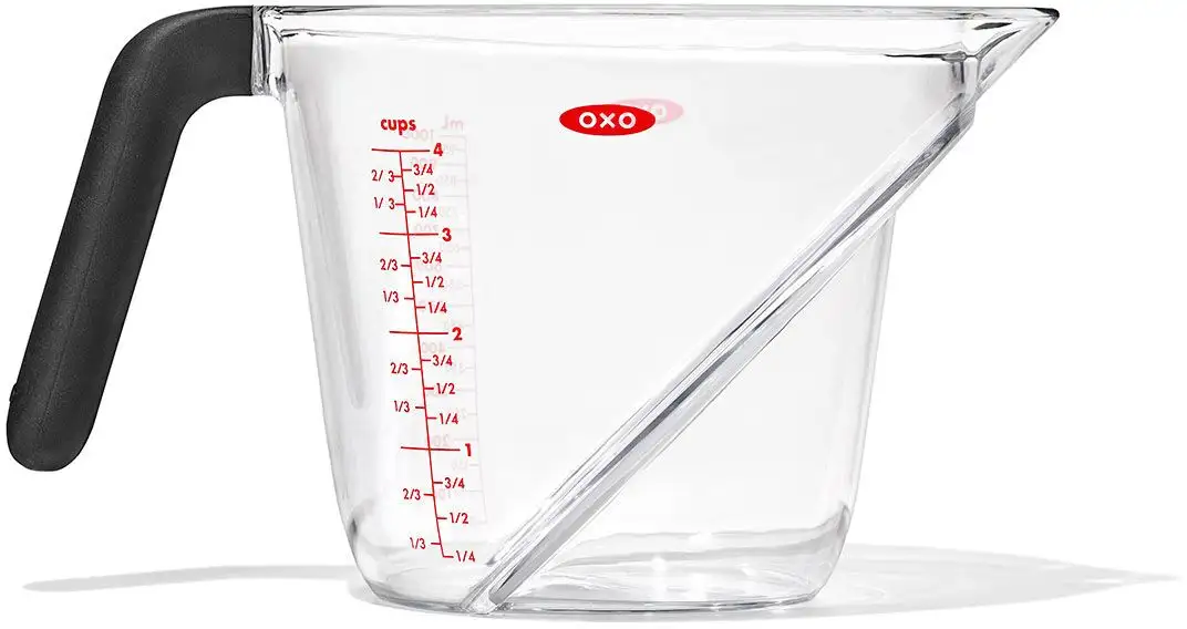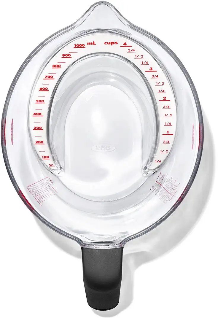 Запатентованная сплющенная поверхность мерного стаканчика OXO Good Grips позволяет считывать измерительные отметки сверху во время наливания без необходимости наклоняться или поднимать стаканчик на уровень глаз. Специальная конструкция мерного стаканчика позволяет точно дозировать без необходимости последующей корректировки количества. На кружке имеется маркировка чашек и миллилитров, а благодаря прочной конструкции ее можно мыть в посудомоечной машине. Также доступны версии объемом 250 мл и 500 мл.