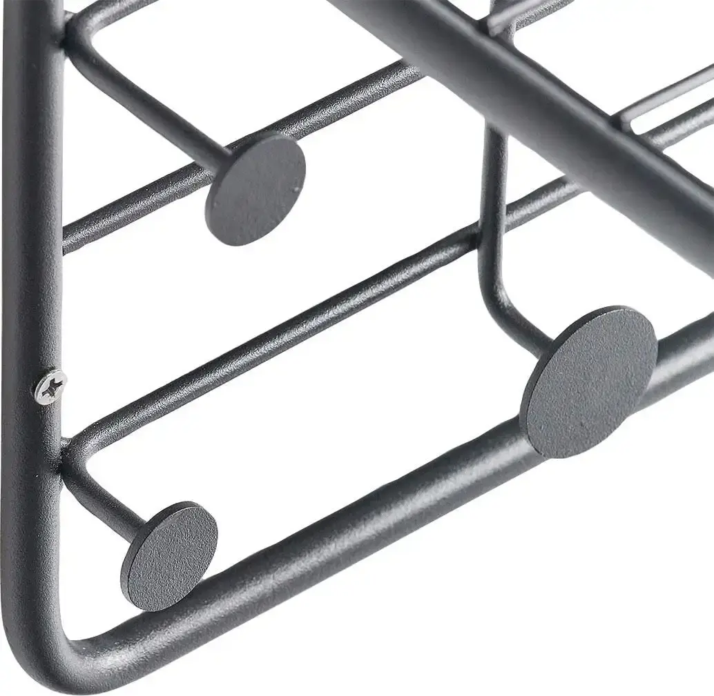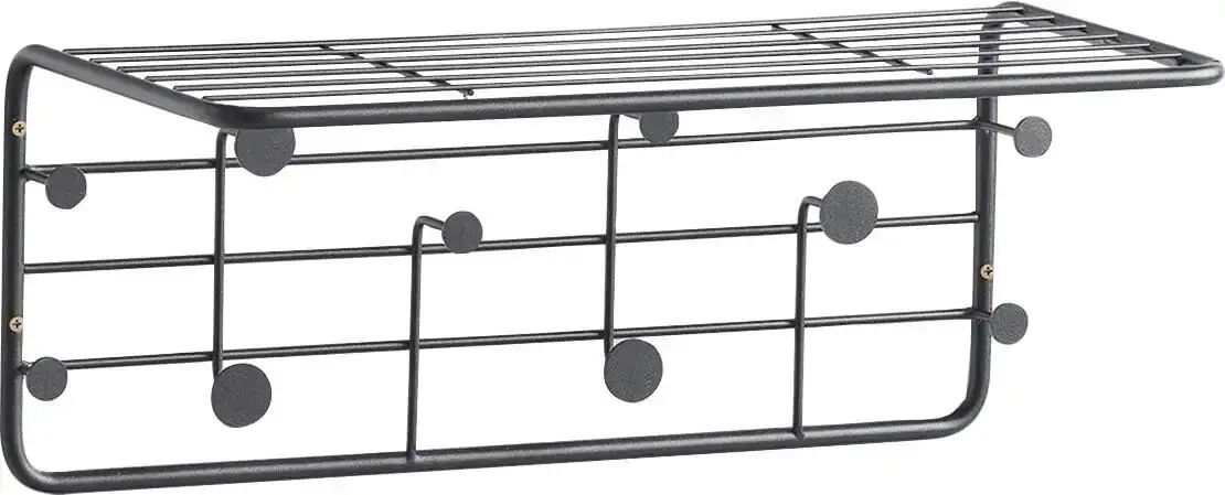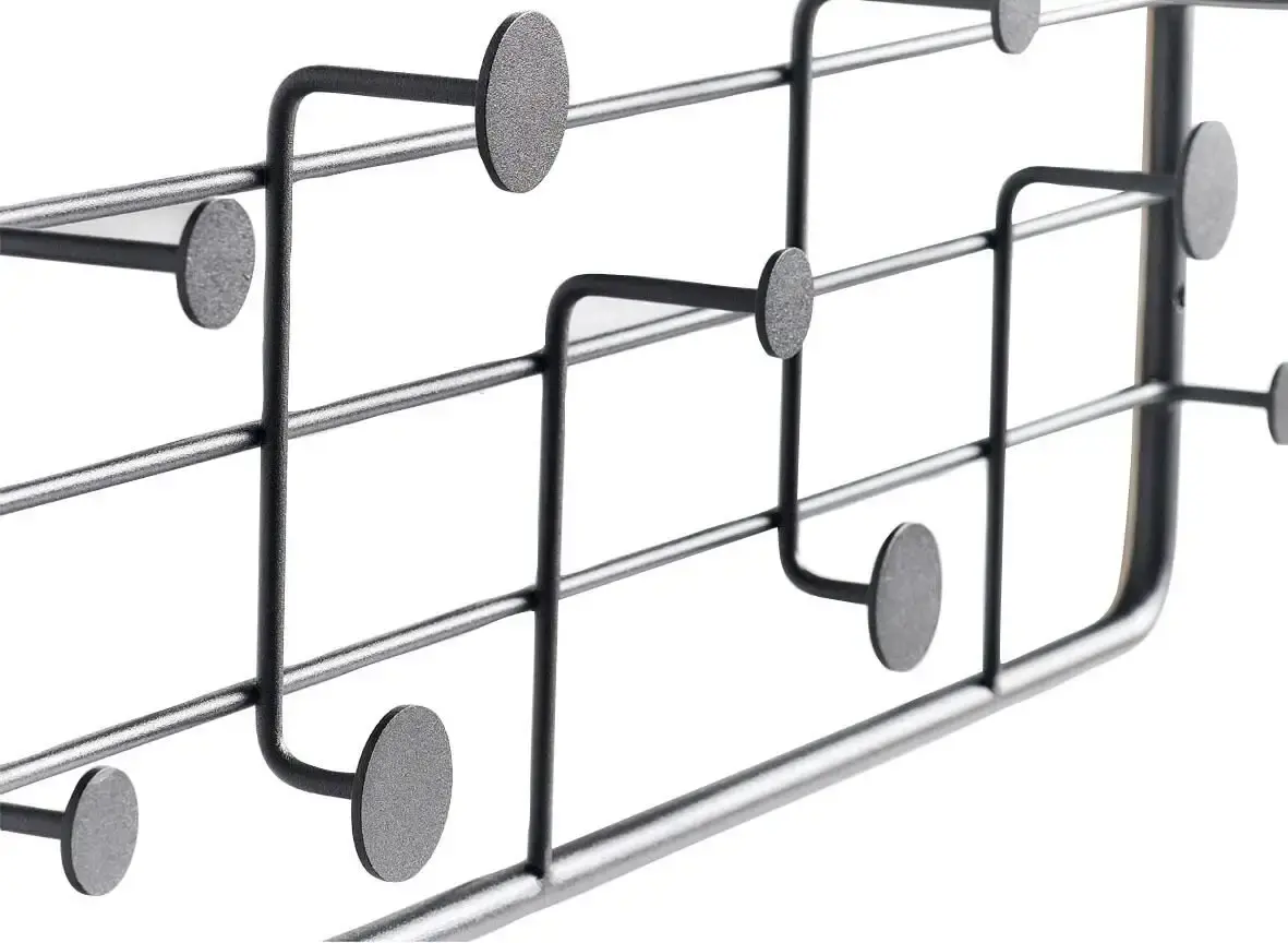 Хотите чего-то необычного? Наша современная настенная вешалка из черного металла определенно отличается необычностью! Вешалка идеально впишется в общий вид вашей прихожей и привлечет внимание своим необычным дизайном. Будь то в ванной комнате для полотенец и халатов или в прихожей для курток, пальто и шапок — полку можно использовать по-разному, и она всегда будет хорошо выглядеть. Шарфы, шапки или сумки можно легко разместить на полке, а куртки или пальто можно повесить на десять крючков.