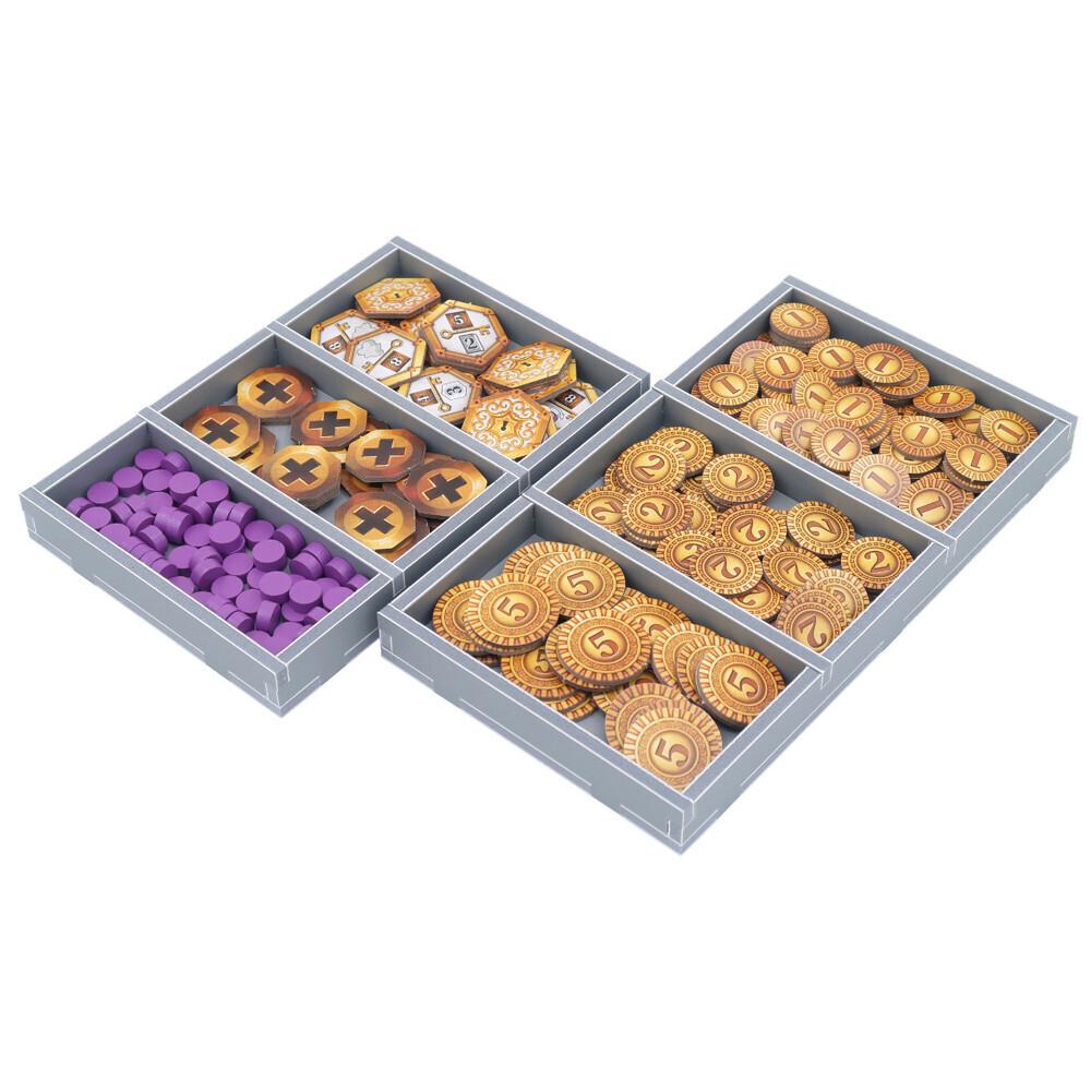 Вставка совместима с Age of Innovation. Дизайн обеспечивает как эффективное хранение, так и улучшенный игровой процесс. Многие лотки можно использовать во время игры, и они значительно облегчают подготовку и уборку. Доски и книги правил служат крышкой над лотками.