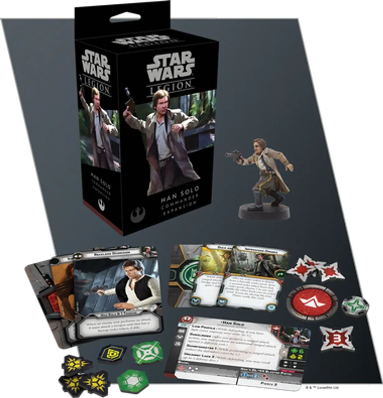 В дополнении «Хан Соло «Командир» лидеры повстанцев найдут все, что им нужно, чтобы добавьте Хана Соло в качестве командира в свои армии «Звездные войны: Легион». На единственной неокрашенной, легко собираемой миниатюре изображен Хан Соло с вытащенным тяжелым бластерным пистолетом DL-44 и готовым к выстрелу. Три новые карты улучшений дают вам инструменты для оснащения Хана Соло или другого отряда для битвы, а три командные карты позволяют вам проявить фирменную смелость и хвастовство Хана на поле боя.