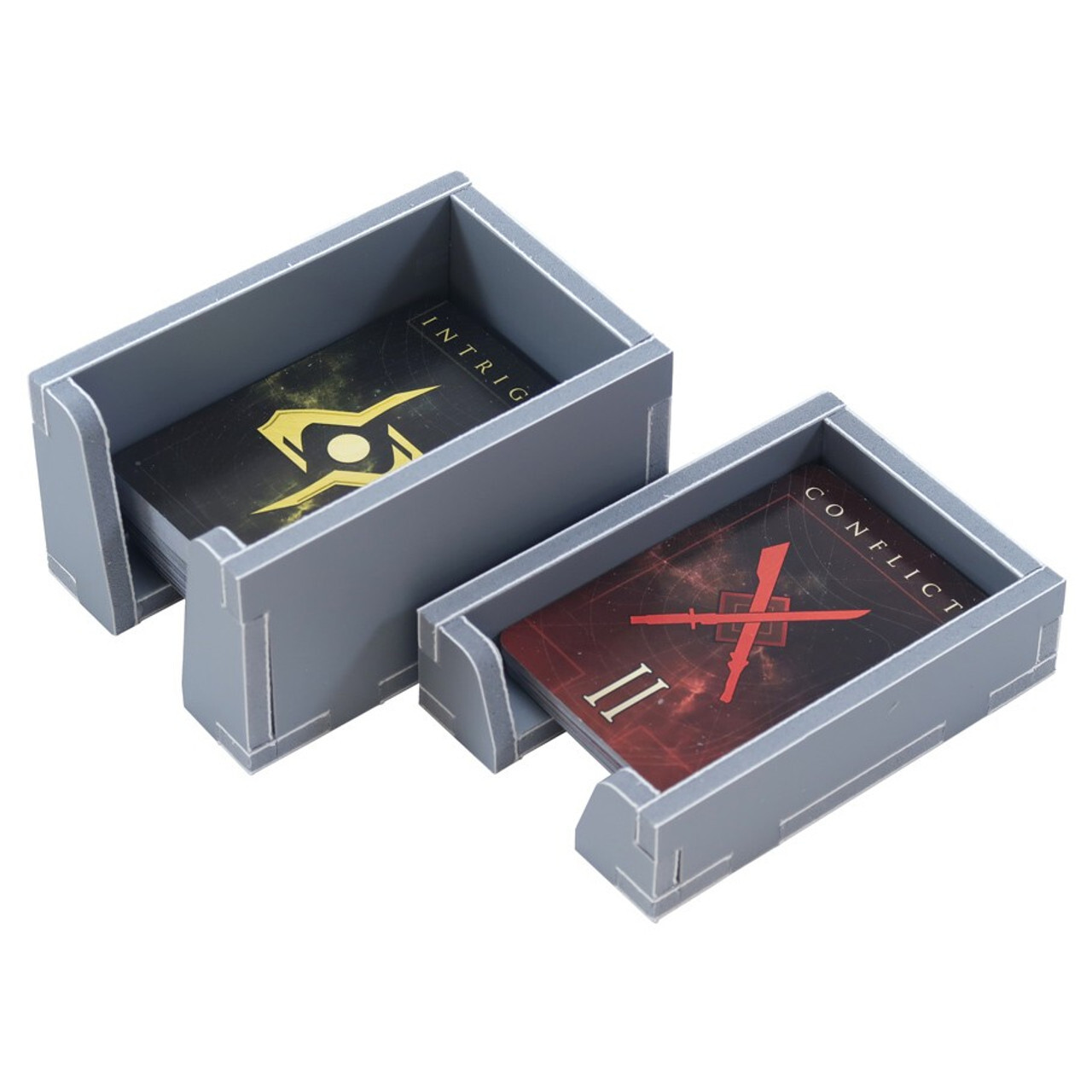 Вставка, совместимая с Dune Imperium, включая расширение Dune: Imperium – Rise of Ix и содержимое Deluxe Upgrade Pack. Конструкция обеспечивает как эффективное хранение, так и улучшенный игровой процесс. Этот продукт состоит из плоской упаковки из 6 листов Evacore. Лотки требуют быстрой и увлекательной сборки с использованием обычного клея ПВА. Многие лотки можно использовать во время игры, и они значительно облегчают установку и уборку. В качественных футлярах достаточно места для всех карт.