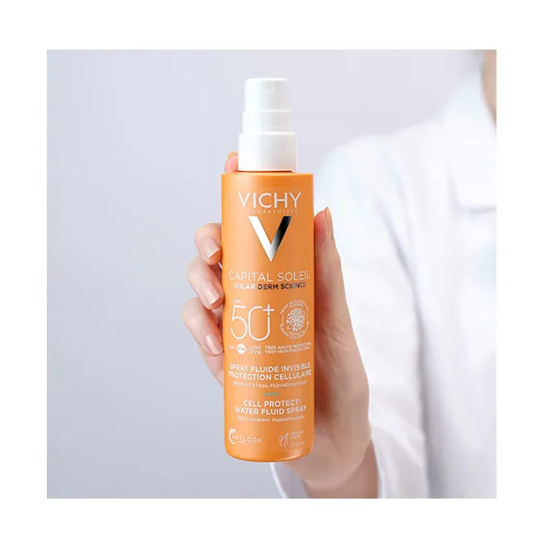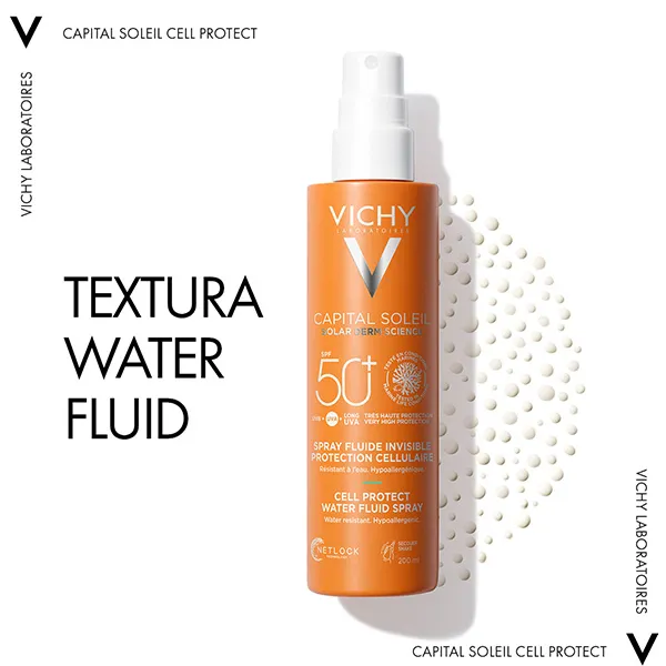 Спрей-флюид Cell Protect Water Fluid SPF50 обеспечивает расширенную защиту на 4 уровнях (UVB, UVA, длинное UVA и антиоксидант) для предотвращения повреждений, вызванных солнцем, даже на уровне клеток кожи.