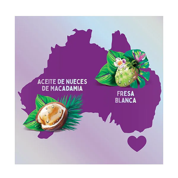 Вода, лауретсульфат натрия, цитрат натрия, кокамидопропилбетаин, ксилолсульфонат натрия, стеариловый спирт, хлорид натрия, цетиловый спирт, отдушка, лимонная кислота, бензоат натрия, глицерин, салицилат натрия, гуар-гидроксипропилтримоний хлорид, лимонен, поликватерниум-6, гидроксид натрия, Тригидроксистеарин, поликватерниум-10, тетранатрий ЭДТА, линалоол, масло семян макадамии тернифолиевой, бутиленгликоль, ацетат натрия, экстракт плодов Fragaria Chiloensis