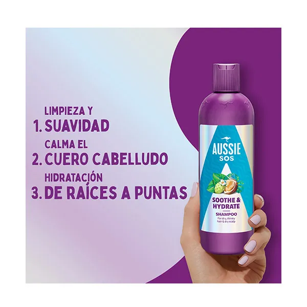 Ваши сухие волосы и кожа головы взывают о помощи? Вы в надежных руках! Шампунь Aussie SOS Soothe & Hydrate станет вашим спасением. Обогащенный австралийскими суперпродуктами, этот нежный шампунь увлажняет и успокаивает кожу головы, одновременно питая волосы, делая их мягкими, гладкими и блестящими от корней до кончиков. Для достижения наилучших результатов используйте в сочетании с другими продуктами из линии ухода за волосами Aussie SOS Soothe. Hydrate, в состав которого входит наш кондиционер и маска для волос. Наша линия Aussie SOS является веганской и не содержит ингредиентов и побочных продуктов животного происхождения.