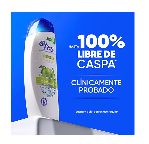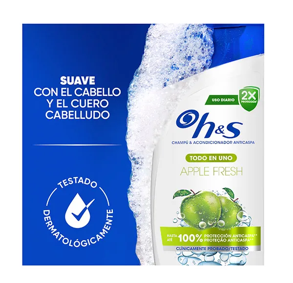 Универсальный шампунь и кондиционер против перхоти H&S Apple Fresh для всех типов волос и кожи головы эффективен даже против самой стойкой перхоти. Этот ежедневный шампунь для мужчин и женщин с формулой Microbiome Balance воздействует на основную причину перхоти и балансирует микробиом кожи головы. Он действует против видимой и невидимой перхоти, выделяя в два раза больше защитных ингредиентов, которые проникают в поры и предотвращают повторное появление сильной и стойкой перхоти. Клинически проверенная, дерматологически протестированная, pH-сбалансированная формула шампуня «Все в одном» содержит на 25 % больше кондиционирующих веществ, чем шампунь Head &Shoulders.
