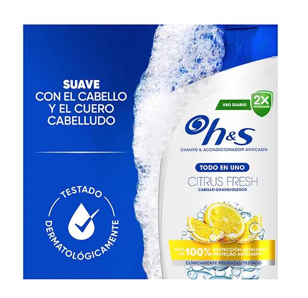 Универсальный шампунь и кондиционер против перхоти H&S Citrus Fresh для жирных волос эффективен даже против самой стойкой перхоти. Этот ежедневный шампунь для мужчин и женщин с формулой Microbiome Balance воздействует на основную причину перхоти и балансирует микробиом кожи головы. Он борется с видимой и невидимой перхотью, выделяя в два раза больше защитных ингредиентов, которые проникают в поры и предотвращают повторное появление сильной и стойкой перхоти. Эта формула содержит на 25% больше кондиционирующих веществ по сравнению с обычным шампунем H&S для чистых и мягких волос. ИСПОЛЬЗУЙТЕ ЕЖЕДНЕВНО. ДЛЯ ЛУЧШЕГО РЕЗУЛЬТАТА Мойте после мытья, улучшает увлажнение и уменьшает проблемы кожи головы, устраняя перхоть.