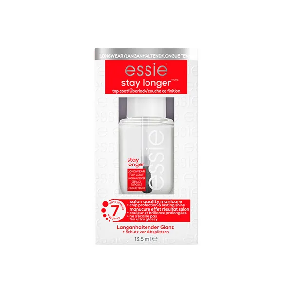 Откройте для себя новый топ Top Coat Stay Longer от Essie и получите долговечный маникюр с ультра-блестящим покрытием. Его формула защищает от сколов и сохраняет цвет и блеск до 7 дней.