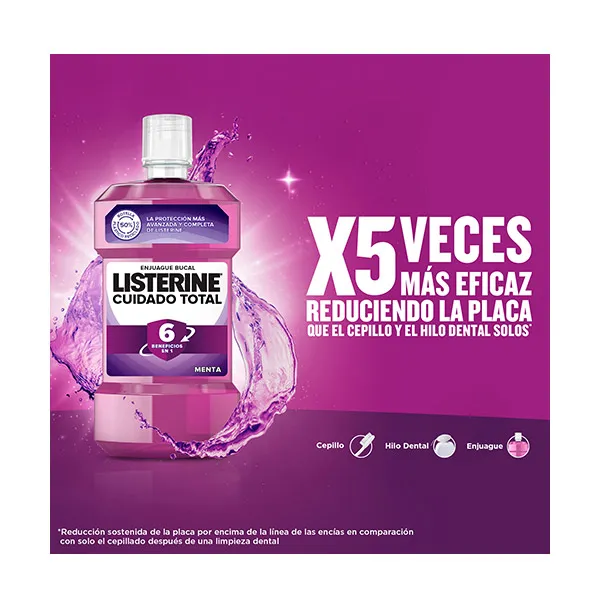 Самая передовая и полная защита Listerine для полного здоровья полости рта. Благодаря сочетанию эфирных масел с фторидом и хлоридом цинка в этой жидкости для полоскания рта Listerine Total Care гарантирует глубокую очистку и полную защиту, что обеспечивает 6 преимуществ для полного здоровья полости рта. налет.- Сохраняет здоровье десен.- Укрепляет зубы, защищая их от кариеса.- Предотвращает образование зубного камня, помогая поддерживать естественную белизну зубов.- Устраняет бактерии между зубами.- До 24 часов свежего дыхания. Используйте жидкость для полоскания рта два раза в день. Налейте 20 мл (4 чайные ложки по 5 мл) в стакан, прополощите зубы и десны в течение 30 секунд и выплюньте. Не рекомендуется детям до 12 лет.