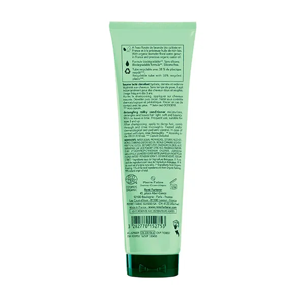 Этот БИО-распутывающий уход для всех типов волос действует мгновенно и распутывает волосы, не утяжеляя их. Его профессиональная формула с органической цветочной водой лаванды и органическим касторовым маслом делает его идеальным продуктом для ежедневного ухода за волосами для всей семьи в возрасте от 3 лет и старше. Молочный и с нежным ароматом, он тает на волосах, мгновенно увлажняя и распутывая их. Красивые, здоровые, мягкие и блестящие, волосы легкие и прекрасно распутываются. С экологической сертификацией. Формула 99% натурального происхождения. Биоразлагаемый. Веган. Без силиконов. В соответствии с тестом OECD301B. Никаких ингредиентов животного происхождения. ПРЕИМУЩЕСТВА: РАСПАСЫВАЕТ БЕЗ КЕМПИНГА: растекается по длине и мягко распутывает волосы. НЕМЕДЛЕННОЕ ДЕЙСТВИЕ: уход за волосами, не оставляя их на голове, легко смывается. SENSORY FORMULA: формула без силикона, молочная галеновая формула и свежий аромат. РАСПАСЫВАЕТ БЕЗ СЛИВАНИЯ: тает по длине и мягко распутывает волосы. НЕМЕДЛЕННОЕ ДЕЙСТВИЕ: уход за волосами, не оставляя их на голове, легко смывается. SENSORY FORMULA: формула без силикона, молочная галеновая формула и свежий аромат.