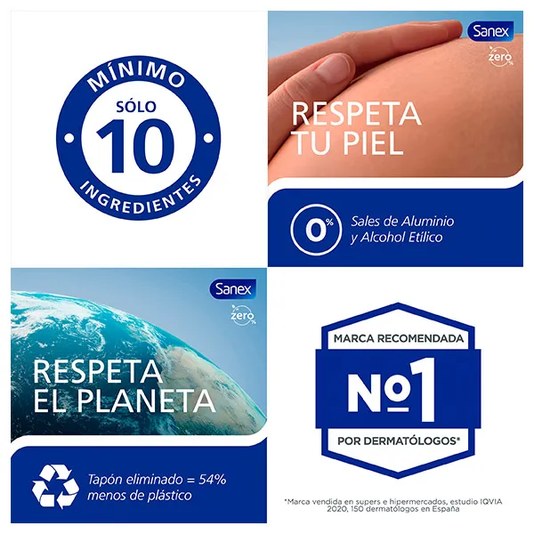 Он обеспечивает эффективную защиту от неприятного запаха в течение 48 часов, помогает сохранить кожу здоровой и увлажненной, а также дает ощущение свежести. Sanex 0% Использует натуральные элементы, без алюминия и спирта, что помогает снизить воздействие на окружающую среду и свести к минимуму. упаковочные отходы.