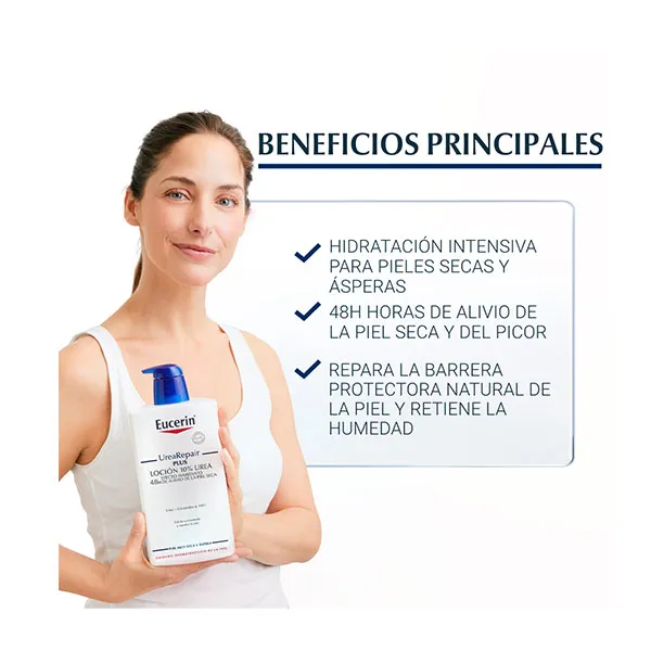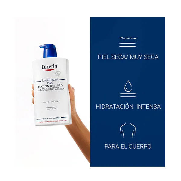 UreaRepair Plus Lotion 10% Мочевина Немедленно облегчает симптомы очень сухой кожи. Очень сухая кожа может выглядеть жесткой, красной, грубой, шелушащейся и зудящей. Этот быстро впитывающийся лосьон для тела от Eucerin обеспечит вам необходимый ежедневный уход:1. Глубоко увлажняет грубую и сухую кожу.2. Снимает сухость и зуд кожи на 48 часов.3. Восстанавливает естественный защитный барьер кожи и удерживает влагу.4. Подходит для сухой и больной кожи.5. Никаких красителей, ароматизаторов и жирных остатков. Этот увлажняющий лосьон для тела без красителей, ароматизаторов и жирных остатков содержит керамиды, которые уменьшают потерю влаги. Мочевина и другие NMF удерживают воду, уменьшая обезвоживание и шероховатость кожи. Клинические исследования показали, что этот увлажняющий лосьон для тела очень эффективен при уходе за кожей и очень хорошо переносится даже очень сухой и больной кожей. Исследования показали значительное уменьшение симптомов сухости кожи при ежедневном использовании этого крема для тела.