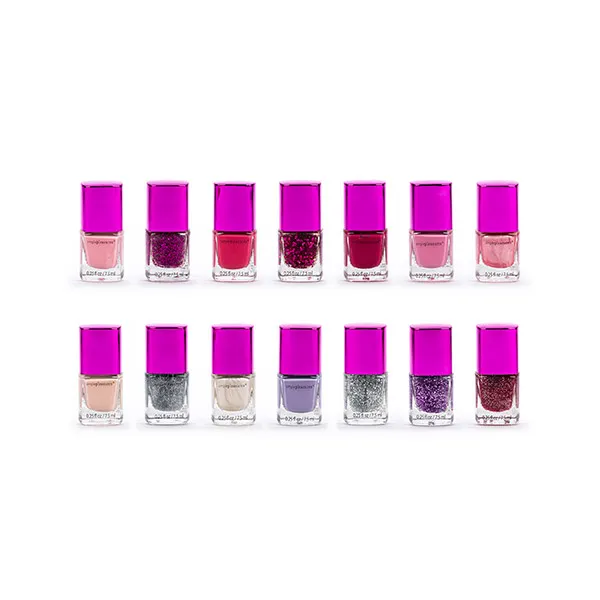 Набор лаков для ногтей содержит 14 цветов с блестками и без.