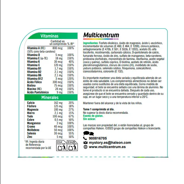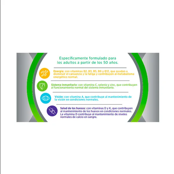Multicentrum Select 50+ — это полноценная пищевая добавка с витаминами и минералами в специально сбалансированной формуле для взрослых старше 50 лет. Преимущества: ЖИЗНЕННОСТЬ: Содержит тиамин, рибофлавин (витамин B2), витамин B6, витамин B12, ниацин, биотин. и пантотеновая кислота, которые способствуют нормальному энергетическому обмену.ИММУННАЯ СИСТЕМА: с витамином С, селеном и цинком, которые способствуют нормальному функционированию иммунной системы.ЗРЕНИЕ: с витамином А, который способствует поддержанию зрения в нормальных условиях.ЗДОРОВЬЕ КОСТЕЙ: С витаминами D и K, которые способствуют поддержанию костей в нормальных условиях. Витамин D способствует поддержанию нормального уровня кальция в крови. Не содержит глютена, лактозы и сахара.