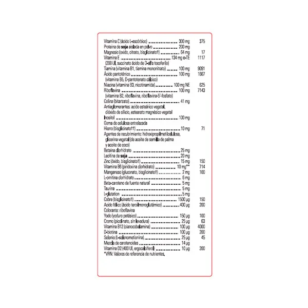 СОСТАВ: Наполнители: микрокристаллическая целлюлоза, гороховый крахмал, альгинат, дикальцийфосфат; Кальций (цитрат, бисглицинаткарбонат); Витамин С (L-аскорбиновая кислота); Порошок изолята соевого белка; Магний (оксид, цитрат, бисглицинат); Витамин Е (сукцинат D-альфа-токофериловой кислоты); Тиамин (витамин В1, тиамина мононитрат); Пантотеновая кислота (витамин В5, D-пантотенат кальция); Ниацин (витамин В3, никотинамид); Рибофлавин (витамин В2, рибофлавин, рибофлавин-5'-фосфат); Холин (битартрат); Антислеживатели: растительная стеариновая кислота, диоксид кремния, растительный стеарат магния; Инозитол; Сшитый целлюлозный каучук; Железо (бисглицинат); Покрывающие вещества: гидроксипропилметилцеллюлоза, растительный глицерин (из пальмоядрового и кокосового масла); Бетаина гидрохлорид; Соевый лецитин; Цинк (оксид, бисглицинат); Витамин В6 (пиридоксина гидрохлорид); Марганец (глюконат, бисглицинат); L-орнитина гидрохлорид; Бета-каротин природного происхождения; Таурин; L-глутатион; Медь (бисглицинат), Фолиевая кислота (тероилмоноглутаминовая кислота); Краситель: рибофлавин, Йод (йодид калия); Пиколинат хрома); Витамин B12 (цианокобаламин); D-биотин; селен (L-селенометионин); каротиноидная смесь; Витамин D2 (эргокальциферол).