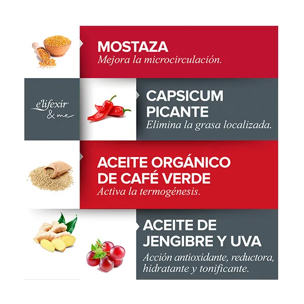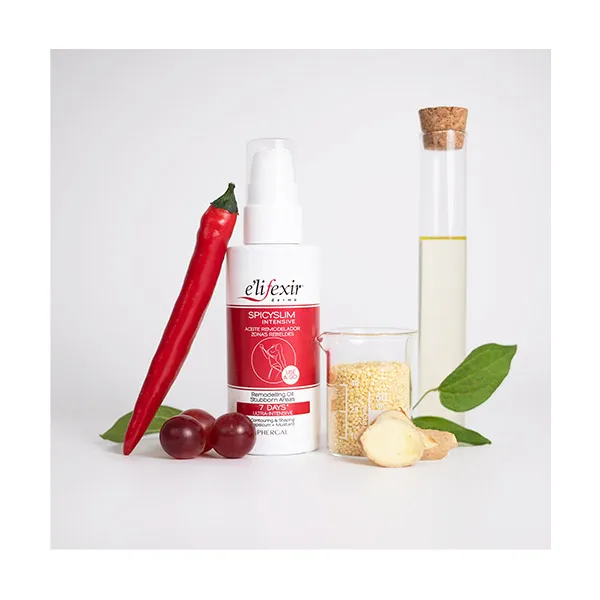 Elfexir Dermo Spicyslim — это сухое масло, способствующее сжиганию жира, для проблемных участков. Инновационный ультраинтенсивный уход, гарантирующий видимые результаты всего за 7 дней*. Содержит горчицу и пряный перец, которые активизируют кровообращение для большей эффективности и усиливают термогенез, улучшая выведение шлаков. локализованный жир. Кроме того, он содержит масло зеленого кофе, которое поддерживает и стимулирует клеточную энергию, обеспечивая видимые результаты в течение 7 дней.