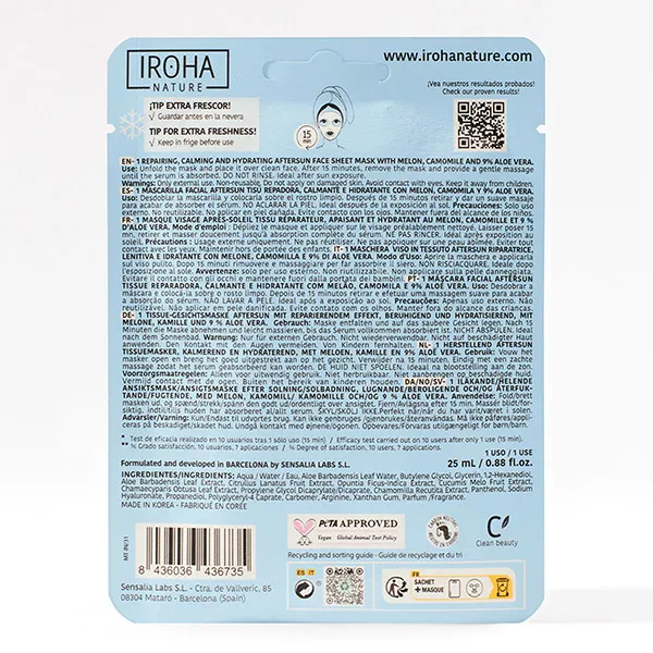 Восстанавливает, успокаивает и увлажняет кожу, поврежденную солнцем. Восстанавливающая маска после загара способствует регенерации кожи и уменьшению покраснений, мгновенно успокаивая и освежая кожу лица. Кроме того, он глубоко увлажняет, предотвращая сухость, поддерживает оптимальный уровень гидратации кожи и немедленно снимает ощущение жжения. Все это благодаря формуле с алоэ вера, дыней и ромашкой, которая регенерирует и укрепляет кожный барьер, тем самым достигая более устойчивая, более защищенная и укрепленная кожа. Идеально подходит для всех типов кожи, особенно для кожи, неравнодушной к солнцу.