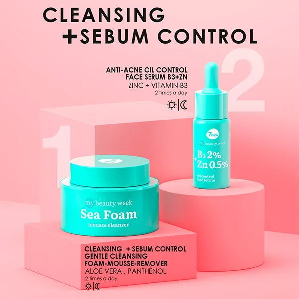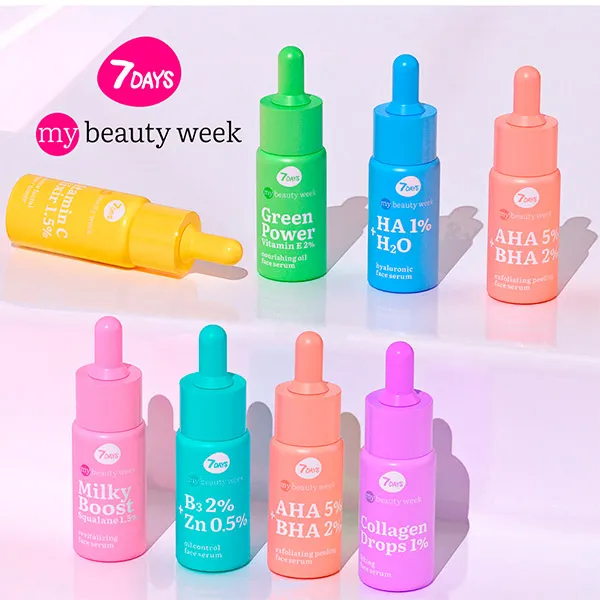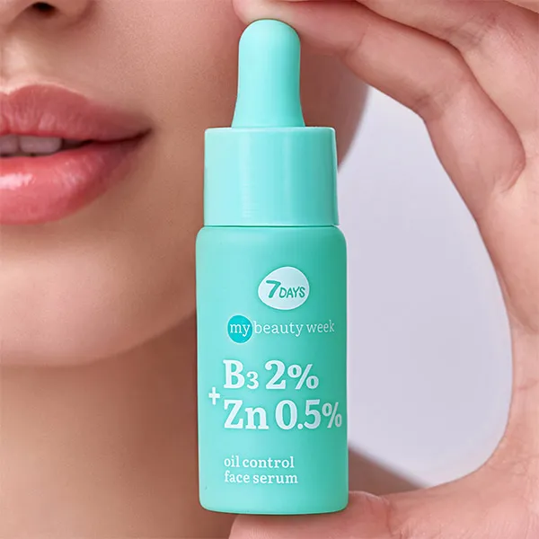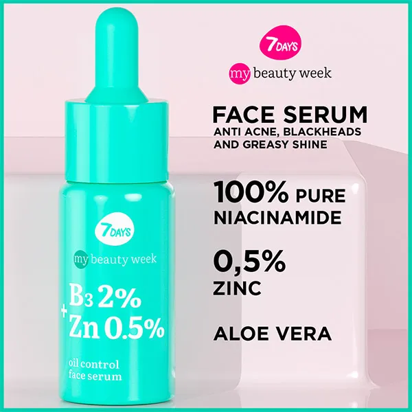 Концентрат-сыворотка для лица 7DAYS B3+ZN мгновенно помогает бороться с жирным блеском и пятнами на коже. Уход MY BEAUTY WEEK SMART – это сочетание интеллектуальных ингредиентов и инновационных формул со 100% эффективностью, благодаря которому ваша кожа становится чистой, матовой и мягкой, с ровным тоном и ощущением свежести. Интенсивная формула с активными ингредиентами: витамином В3, цинком, экстрактами алоэ и чайного дерева. Ниацинамид увлажняет, укрепляет, сужает поры, регулирует выработку кожного сала и матирует кожу. Цинк устраняет покраснения, борется с пятнами и предотвращает их появление. Легкость текстуры сыворотки гарантирует, что вы не почувствуете себя покрытой липкой пленкой, ее аромат приятный и воздушный.