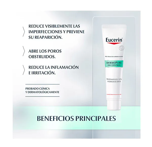 Наше инновационное средство Eucerin DERMOPURE OIL CONTORL Treatment с 10% гидроксикислотами было специально разработано для уменьшения появления прыщей, папул и пустул, а также для размытия следов прыщей. Подходит для всех форм прыщей. от легкой до умеренной степени и имеет тройной эффект: 10% комплекс гидроксикислот содержит очень эффективную комбинацию пилинговых агентов, гликолевой кислоты, салициловой кислоты и полигидроксикислоты, которые помогают реконструировать поверхность кожи, устраняют закупорку пор, уменьшают количество бактерий, удаляет омертвевшие клетки кожи и предотвращает появление новых пятен. Содержит ликохалкон А, который, как было доказано, уменьшает воспаление и успокаивает раздражение. Eucerin DERMOPURE OIL CONTORL 10% Hydroxy Acid Treatment начинает заметно улучшать состояние кожи уже через неделю, и со временем кожа становится более чистой и гладкой. Его можно использовать во время беременности, но не следует наносить на открытые участки кожи. получение лечения от прыщей.