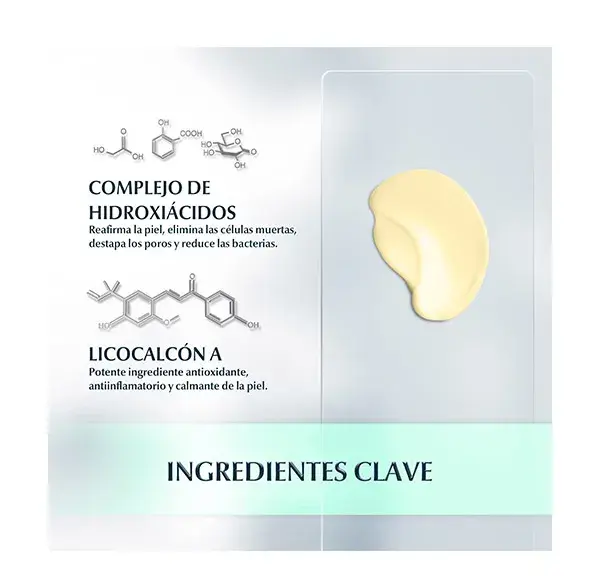 Вода, гликолевая кислота, диметикон, глицерин, тапиоковый крахмал, цетеариловый спирт, глицерилстеарат, гидроксид натрия, глюконолактон, стеарат ПЭГ-100, салициловая кислота, дистеарат ПЭГ-150, экстракт корня солодки инфлата, пантенол, ксантановая камедь, тринатрий ЭДТА, феноксиэтанол. , Парфюм