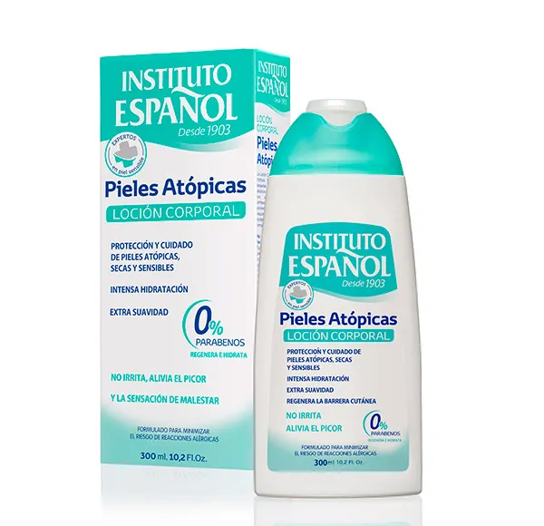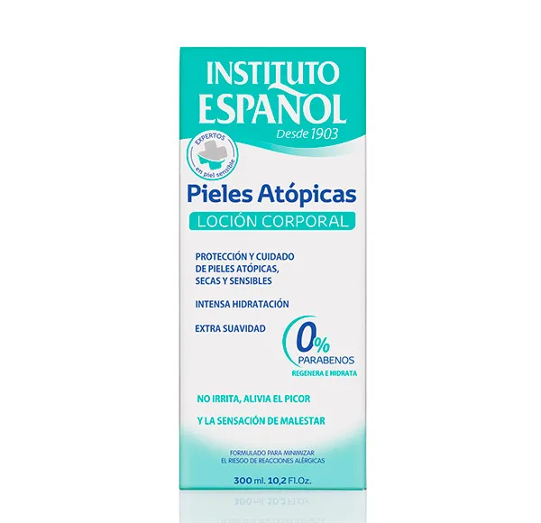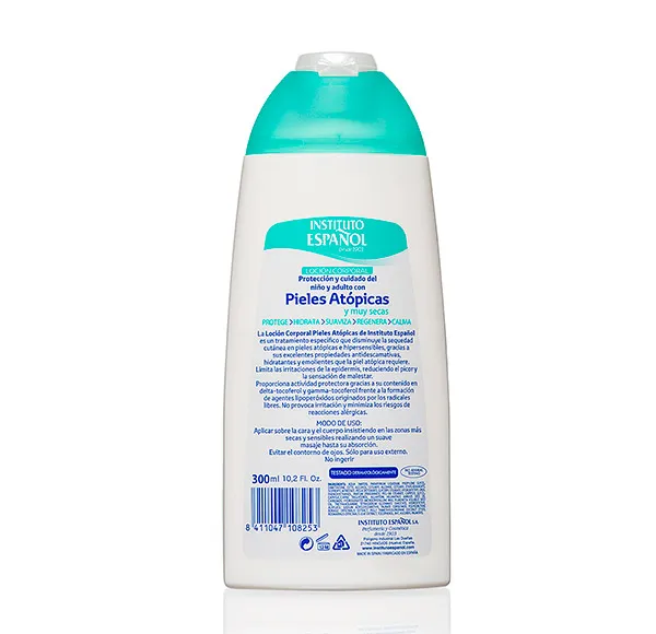 Лосьон для тела Испанского института — это специальное средство, которое уменьшает сухость кожи при атопической и гиперчувствительной коже благодаря своим превосходным противошелушащим, увлажняющим и смягчающим свойствам, необходимым для атопической кожи. Ограничивает раздражение эпидермиса, уменьшая зуд и чувство дискомфорта. Его особая формула эффективно защищает благодаря тройному действию. Интенсивное увлажнение, действие против сухости и регенерация естественных защитных сил, которые гарантируют уход и мягкость кожи, снимая раздражение и зуд. Он обеспечивает защитную активность благодаря содержанию дельта-токоферола и гамма-токоферола против образования липопероксидных агентов, вызванных свободными радикалами. Он не вызывает раздражения и минимизирует риски возникновения аллергических реакций.