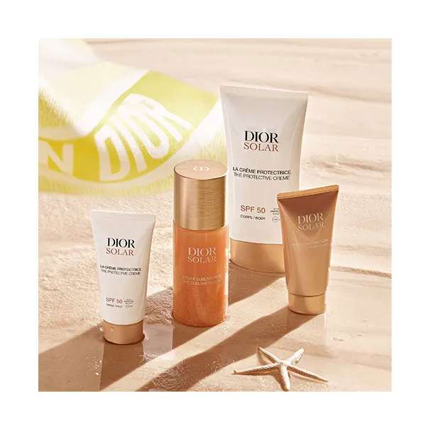 Dior Solar, линия солнцезащитных средств Maison Dior, дополнена солнцезащитным кремом с высокой степенью защиты для тела. Солнцезащитный крем Dior Solar Protective Cream с фактором защиты SPF 50 защищает кожу от лучей UVA и UVB, увлажняет ее и усиливает ее тонкими нотками монои. Его приятная текстура быстро впитывается, не оставляя жирного блеска и белых следов. Солнцезащитный крем Dior Solar Protective Cream SPF 50 защищает. кожу от лучей UVA/UVB, заметно улучшая ее внешний вид. Кожа сияющая и увлажненная, загар равномерный.