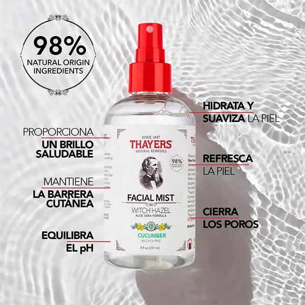 Освежите свою кожу с помощью огуречного спрея Thayers. ПРИВЕТ ЗДОРОВОМУ СИЯНИЮ: наш нежный, не содержащий спирта огуречный спрей с гамамелисом и алоэ вера увлажняет и балансирует pH кожи. Наша формула подходит для всех типов кожи. Придает здоровое сияние и сужает поры. Кроме того, он подготавливает кожу к впитыванию увлажняющих средств и служит отличной основой для макияжа. БЕЗАЛКОГОЛЬНАЯ ФОРМУЛА С 98% НАТУРАЛЬНЫХ ИНГРЕДИЕНТОВ: Наш производственный процесс так же прост, как заваривание чашки чая! Мы используем мацерацию как процесс экстракции, при котором черенки гамамелиса и алоэ вера замачиваются в воде и размягчаются по мере впитывания, создавая таким образом Наша запатентованная смесь гамамелиса и алоэ вера — это то, что делает нас уникальными! Приверженность созданию чистых, эффективных и не тестируемых на животных продуктов высочайшего натурального качества: Не содержит спирта Не подвергается жестокому обращению Не содержит парабенов Некомедогенен 98% натуральных ингредиентов Гамамелис - Экстрагирован без алкоголя, успокаивает и выравнивает тон кожи Алоэ Vera - Увлажняет и укрепляет здоровье кожи, помогает коже чувствовать себя увлажненной. Глицерин - Помогает поддерживать водный барьер кожи. КУЛЬТОВЫЙ ПРОДУКТ: Эликсиры Thayers уже несколько поколений входят в аптечку, предлагая антиоксидантные и антибактериальные свойства. Как только вы их воспользуетесь, вы поймете, почему.