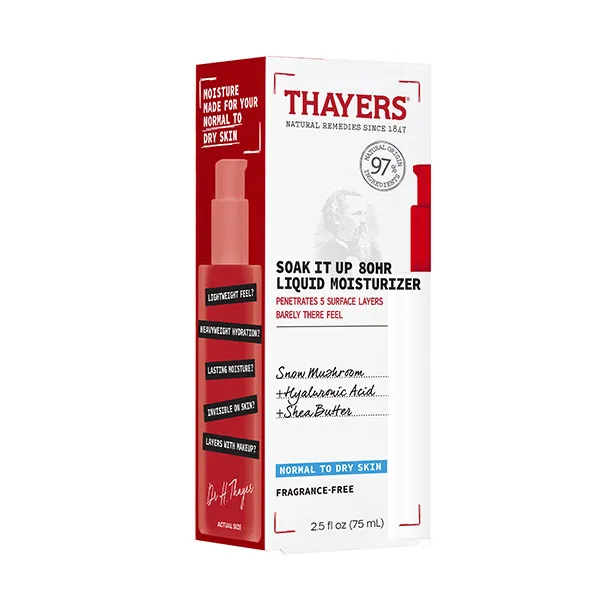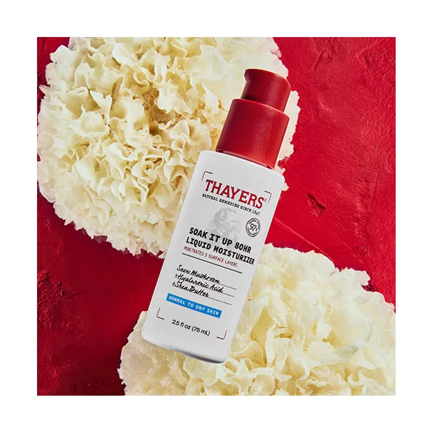 Вам нужно увлажнение, но вам не нравится ощущение густого крема? Жидкий увлажняющий крем THAYERS Soak your Skin обеспечивает 80 часов увлажнения для нормальной и сухой кожи, нуждающейся в интенсивном увлажнении легким прикосновением. Наша жидкая увлажняющая формула настолько легкая, что быстро впитывается в кожу и глубоко проникает в 5 поверхностных слоев, не оставляя ощущения жирности. Кожа остается увлажненной в течение 80 часов, а устойчивость кожного барьера улучшается после однократного применения. Его формула содержит 97% ингредиентов натурального происхождения, а также снежный гриб, гиалуроновую кислоту и масло ши для глубокого увлажнения. Кожа приобретает свежий увлажненный вид, становится упругой и мягкой.