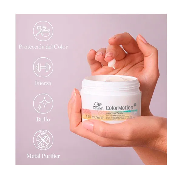 Откройте для себя кондиционирующую маску Wella Professionals Structure+ ColorMotion+ для окрашенных волос. Эта реструктурирующая интенсивная и глубокая кондиционирующая маска для окрашенных волос придает вашим волосам необходимую устойчивость, одновременно укрепляя саму структуру волос. Линейка ColorMotion+ обогащена агентом WellaPlex+, укрепляющим волосы, укрепляя связи внутри волос и восстанавливая их после окрашивания. Кроме того, структурирующий агент WellaPlex+ гарантирует идеальный блеск и длительную послушность волос.