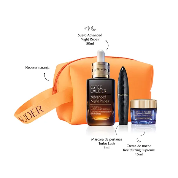 Set the Night is YoungПокоряйте свою кожу летними ночами с помощью нашей сыворотки № 1 Advanced Night Repair. Мы создали этот набор, который включает в себя: 1. Синхронизированный мультивосстанавливающий комплекс Advanced Night Repair в розничном размере, 50 мл: наша сыворотка №1 воздействует на все ключевые признаки старения, включая упругость. Его эксклюзивная технология способствует естественному производству коллагена и созданию новых здоровых клеток. Кожа становится более упругой и здоровой. Линии выглядят более плавными. Кроме того, он содержит высокий уровень гиалуроновой кислоты, позволяющей коже сохранять увлажнение в течение 72 часов. Это помогает создать идеальную среду для оптимизации естественного процесса восстановления кожи. +128% увлажнения и заполняет морщины за одно применение.2. Тушь Turbo Lash в дорожном размере, 3 мл: наша тушь для быстрого наращивания ресниц. Обеспечивает мгновенный мощный объем и длину, а также постоянный уход. Стойкость 12 часов, не размазывается и не слеживается. Эта формула, обогащенная натуральными маслами, защищает и кондиционирует ресницы, делая их заметно сильнее и гуще. Revitalizing Supreme+ Night Travel Size, 15 мл: насыщенный, ультрапитательный ночной крем с гиалуроновой кислотой, который оживляет кожу, делает ее более упругой и сияющей. Этот ультрапитательный крем многофункционального действия специально предназначен для ночного использования. Делает кожу более упругой и значительно уменьшает появление тонких линий во время сна.4. Оранжевая сумка для туалетных принадлежностей Estée Lauder, чтобы носить с собой ваши продукты куда угодно.