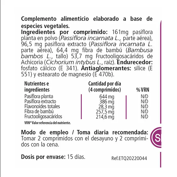 Ингредиенты на таблетку:161 мг порошка растения пассифлоры (Passiflora incarnata L, надземная часть), 96,5 мг пассифлоры экстракт (Passiflora incarnata L, надземная часть), 64,4 мг бамбукового волокна (Bambusa bambos L. стебель), 53,7 мг фруктоолигосахаридов цикория (Cichorium intybus L, корень). Отвердитель: фосфат кальция (Е 341). Антислеживатели: диоксид кремния (Е 551) и стеарат магния (Е 470b).