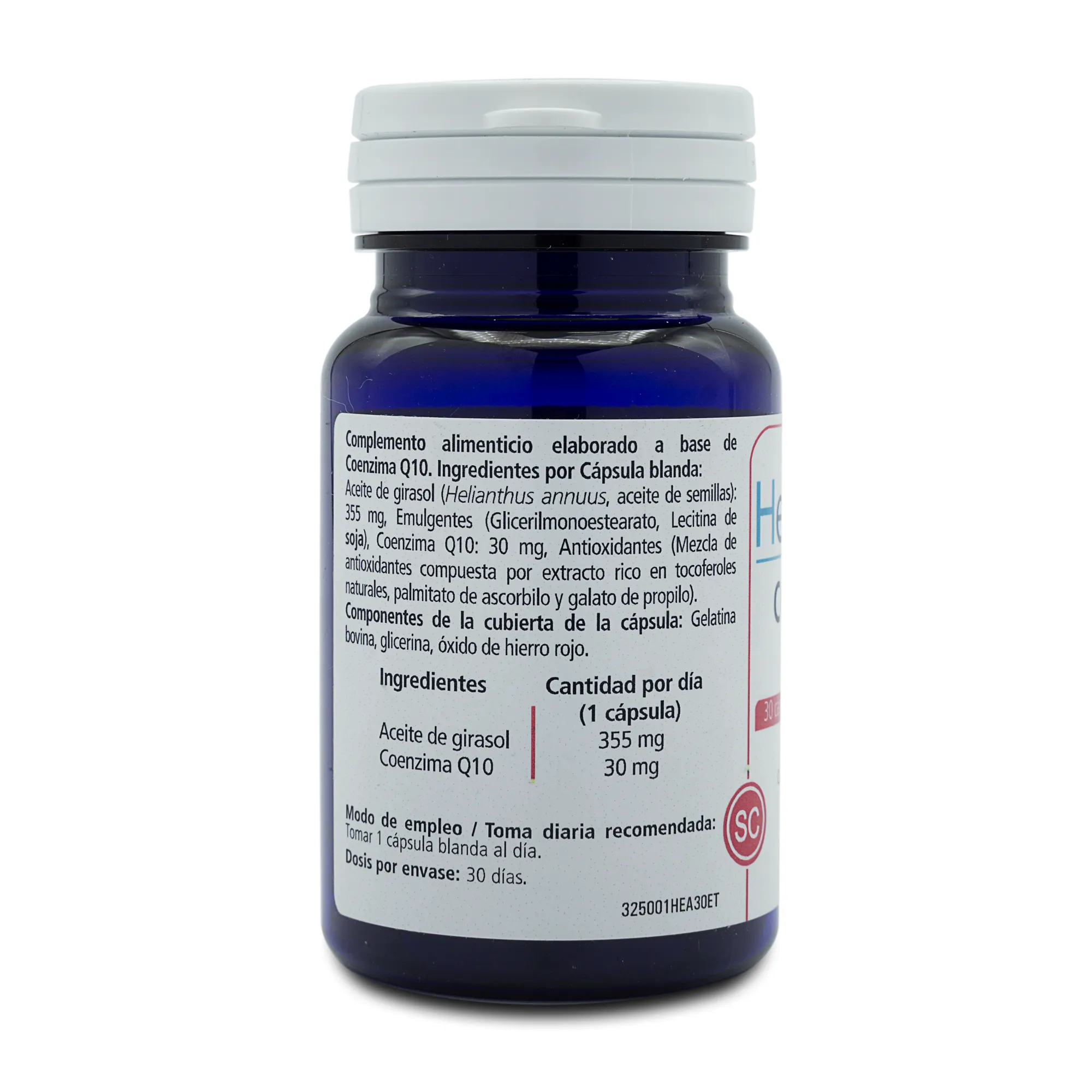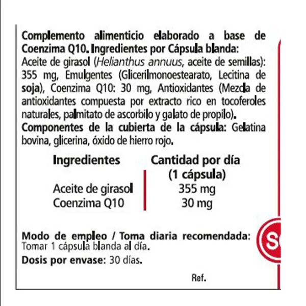 Ингредиенты на мягкую капсулу: Подсолнечное масло (Helianthus annuus, масло семян): 355 мг, эмульгаторы (глицерилмоностеарат). , соевый лецитин), коэнзим Q10: 30 мг, антиоксиданты (смесь антиоксидантов, состоящая из экстракта, богатого природными токоферолами, аскорбилпальмитатом и пропилгаллатом)