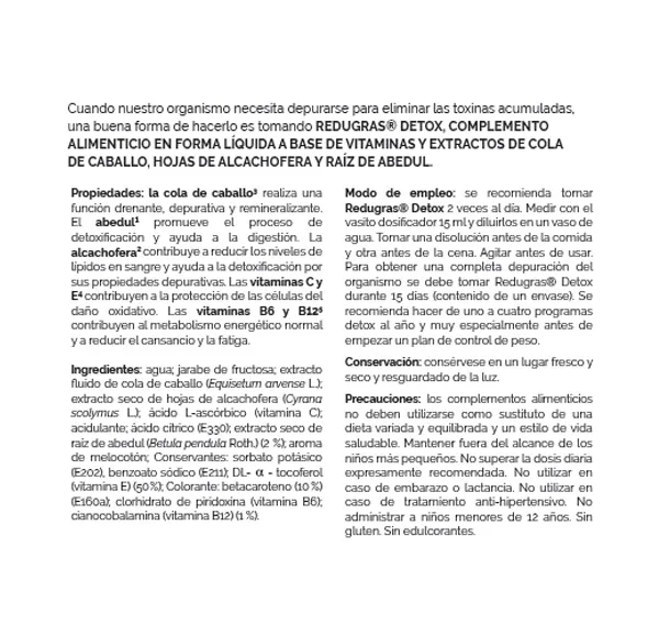 REDUGRAS DETOX, ПИЩЕВАЯ ДОБАВКА В ЖИДКОЙ ФОРМЕ НА ОСНОВЕ ВИТАМИНОВ И ЭКСТРАКТОВ ХВОСТЯ, ЛИСТЬЕВ АРТИХОФЕРА И БЕРЕЗОВЫЙ КОРЕНЬ.