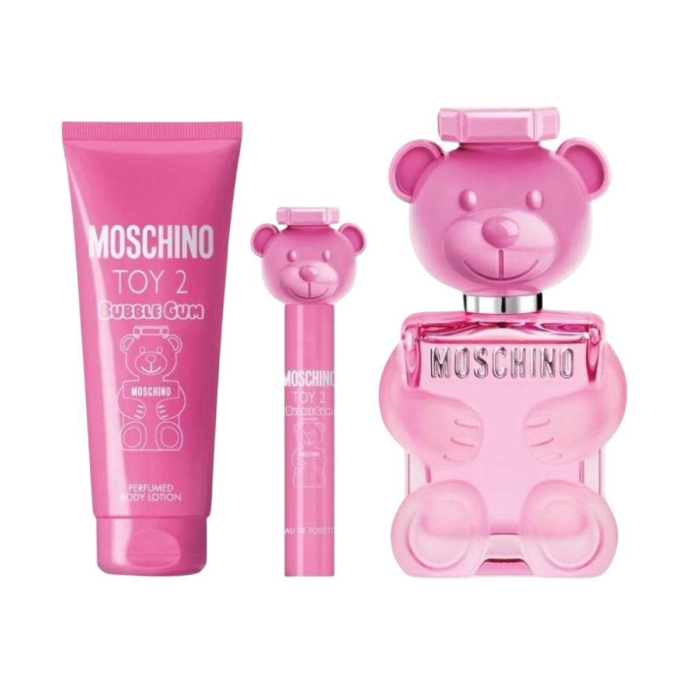 Комплект для женщин от Moschino, в состав которого входят: туалетная вода Moschino Toy 2 Bubble Gum 100 мл и 10 мл, лосьон 100 мл. Идеальная идея для подарка.