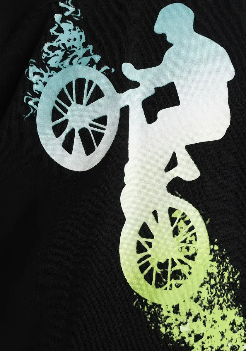 Спортивная рубашка с капюшоном от KIDSWORLD. С обычным широким вырезом. Есть крутой принт. Особенно подходит для катания на роликовых коньках и скейтборде. Топ из эластичного трикотажа чрезвычайно удобен в ношении.
