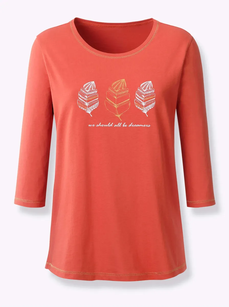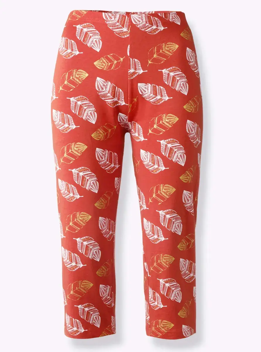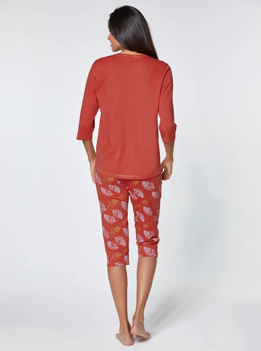 Не пролистывайте дальше! Эта пижама из васпура впечатляет принтом в виде листьев спереди. Круглый вырез горловины, концы рукавов длиной 3/4 и подол украшены швами контрастного цвета. Брюки-капри с удобным эластичным поясом полностью украшены модным принтом в виде слегка мерцающих листьев. 100% хлопок.