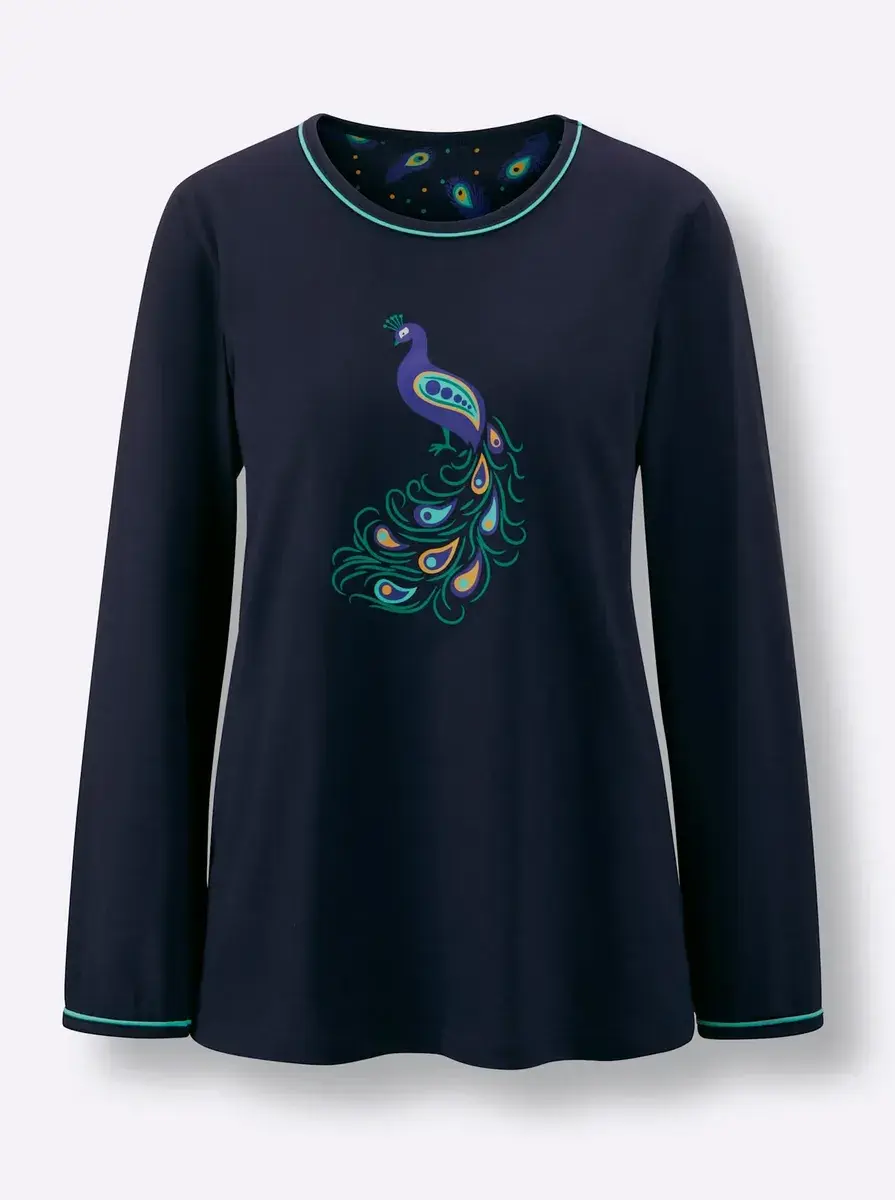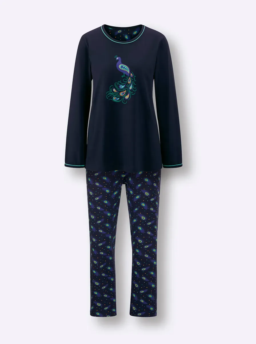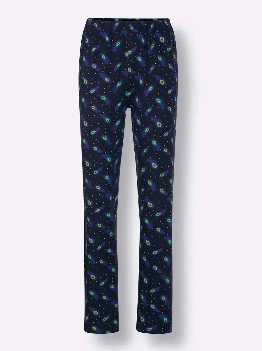Принт павлина спереди делает эту пижаму настоящей приманкой для глаз! Топ с контрастной цветной окантовкой, круглым вырезом и длинными рукавами. Длинные брюки полностью украшены маленькими павлинами и невероятно удобны благодаря эластичному поясу. Одинарный трикотаж. Поддержите инициативу «Хлопок, сделанный в Африке». 100% хлопок.