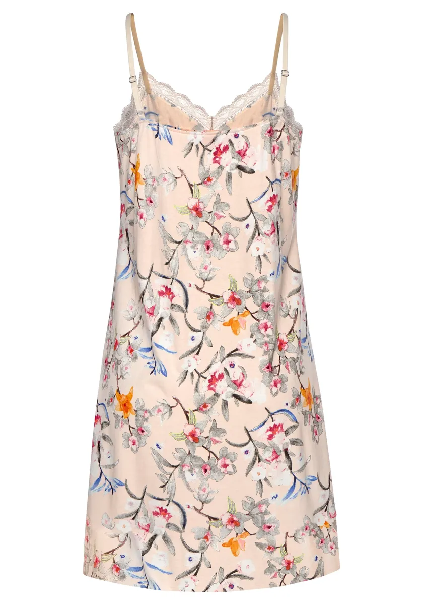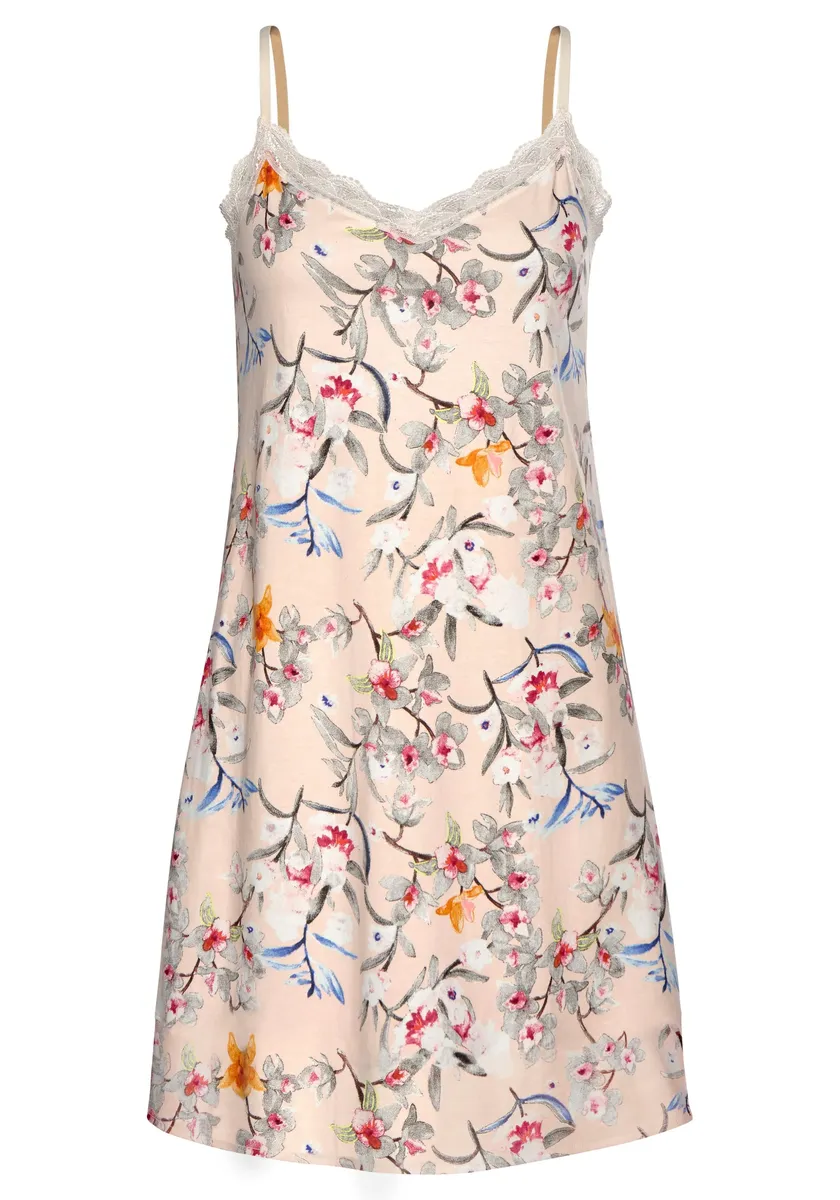 Принт по всей поверхности, кружевная отделка по вырезу спереди. Регулируемые бретели для хорошей посадки. Мягкое качество, 50 % хлопок (поддерживается африканским хлопком), 50 % вискоза.