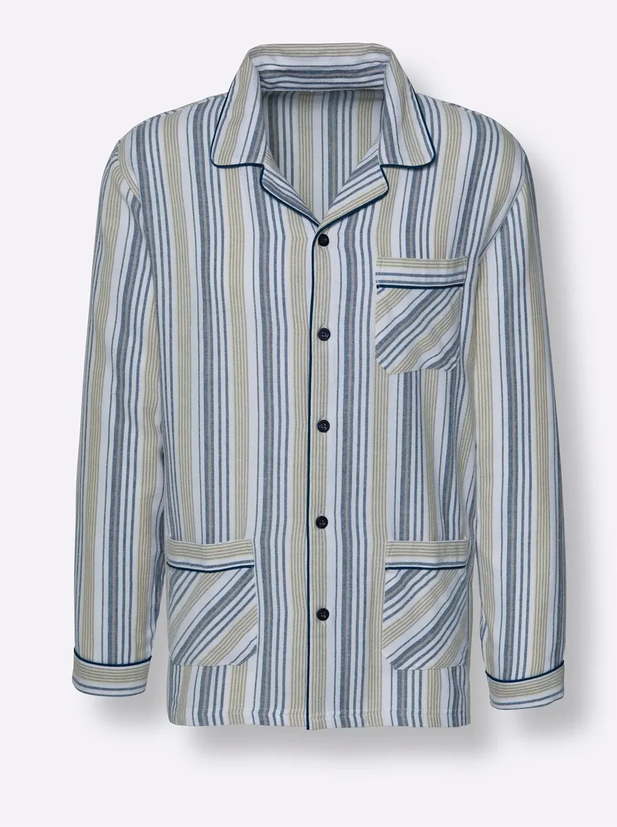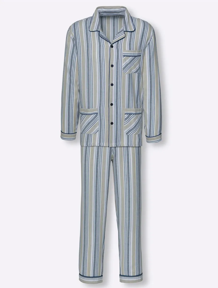 Приятная мягкость и тепло: полосатая пижама качества Finette с ворсом внутри – настоящая классика! Топ с контрастной окантовкой на воротнике с лацканами, планке с пуговицами, манжетах, а также нагрудном кармане и двух других накладных карманах. Брюки с эластичной талией, застежкой на пуговицы и окантовкой на манжетах. 100% хлопок.